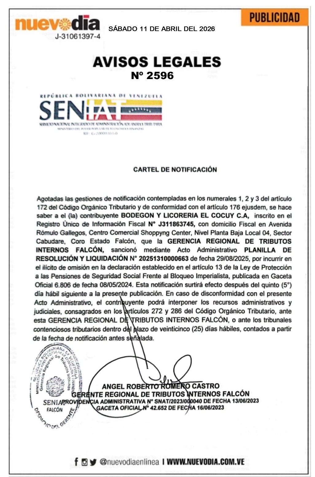 InicioPublicidadLegales PublicidadLegales Cartel de Notificación.Bodegón y Licorería El Cocuy.C.A. 11/04/2026 FacebookTwitterPinterestWhatsApp 2596. 11-04-2026 Cuota FacebookTwitterPinterestWhatsApp Artículo anteriorCartel de Notificación.Bodegón y Licorería El Cocuy.C.A.Artículo siguienteCartel de Notificación.Lucky Pesquería.C.A. Mercadeo NuevoDia Noticias Relacionadas Legales Cartel de Notificación.Remiveca Inversiones.C.A. Legales Cartel de Notificación.Inversiones F.S.R.C.A. Charcutería La Franqueza. Legales Cartel de Notificación.Inversiones Rayan 2013.C.A. Redes Sociales20,299FansMe gusta112,425SeguidoresSeguir4,600SuscriptoresSuscribirte Últimas noticias Destacadas Maestros entregan propuestas para recuperar ingreso económico al ministro Rodríguez Destacadas Así quedaron las tarifas de los peajes tras nuevo aumento Cargar más