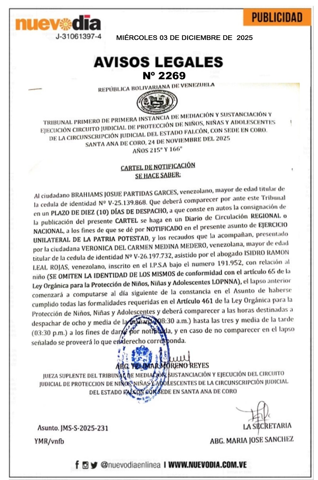 InicioPublicidadLegales PublicidadLegales Cartel de Notificación.Brahiams Josue Partidas Garcés. 03/12/2025 FacebookTwitterPinterestWhatsApp 2269. 03-12-2025 Cuota FacebookTwitterPinterestWhatsApp Artículo anteriorBad Bunny, el artista más escuchado en Spotify durante 2025 Mercadeo NuevoDia Noticias Relacionadas Legales Acta Asamblea Extraordinaria.Soles.C.A. Legales Edicto.Regulo Chirinos Salon. Legales Cartel de Notificación.Miguel Jesús Salón Vargas. Redes Sociales20,299FansMe gusta112,425SeguidoresSeguir4,600SuscriptoresSuscribirte Últimas noticias Destacadas Maduro: La defensa del Esequibo es una victoria del pueblo venezolano Destacadas Venezuela mantiene envíos petroleros por encima de 900.000 bpd pese a tensiones con EE. UU. Cargar más