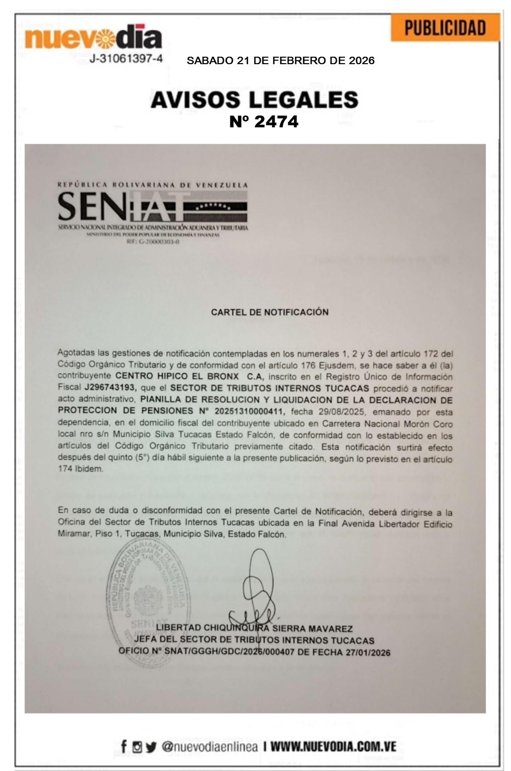 InicioPublicidadLegales PublicidadLegales Cartel de Notificación.Centro Hípico el Bronx.C.A. 21/02/2026 FacebookTwitterPinterestWhatsApp 2474. 21-02-2026 Cuota FacebookTwitterPinterestWhatsApp Artículo anteriorCartel de Notificación.Posada Turística Luz Divina.C.A.Artículo siguienteCartel de Notificación.Inversiones y Bodega Cotutaty.C.A. Mercadeo NuevoDia Noticias Relacionadas Legales Cartel de Notificación.Inversiones Shekina V&J.C.A. Legales Cartel de Notificación.Comercial Alpez.C.A. Legales Cartel de Notificación.Inversiones y Bodega Cotutaty.C.A. Redes Sociales20,299FansMe gusta112,425SeguidoresSeguir4,600SuscriptoresSuscribirte Últimas noticias Destacadas Cabello dice que «hacen diligencias» para que les devuelvan a Maduro y Cilia Flores Destacadas FANB respalda aprobación de la Ley de Amnistía (COMUNICADO) Cargar más