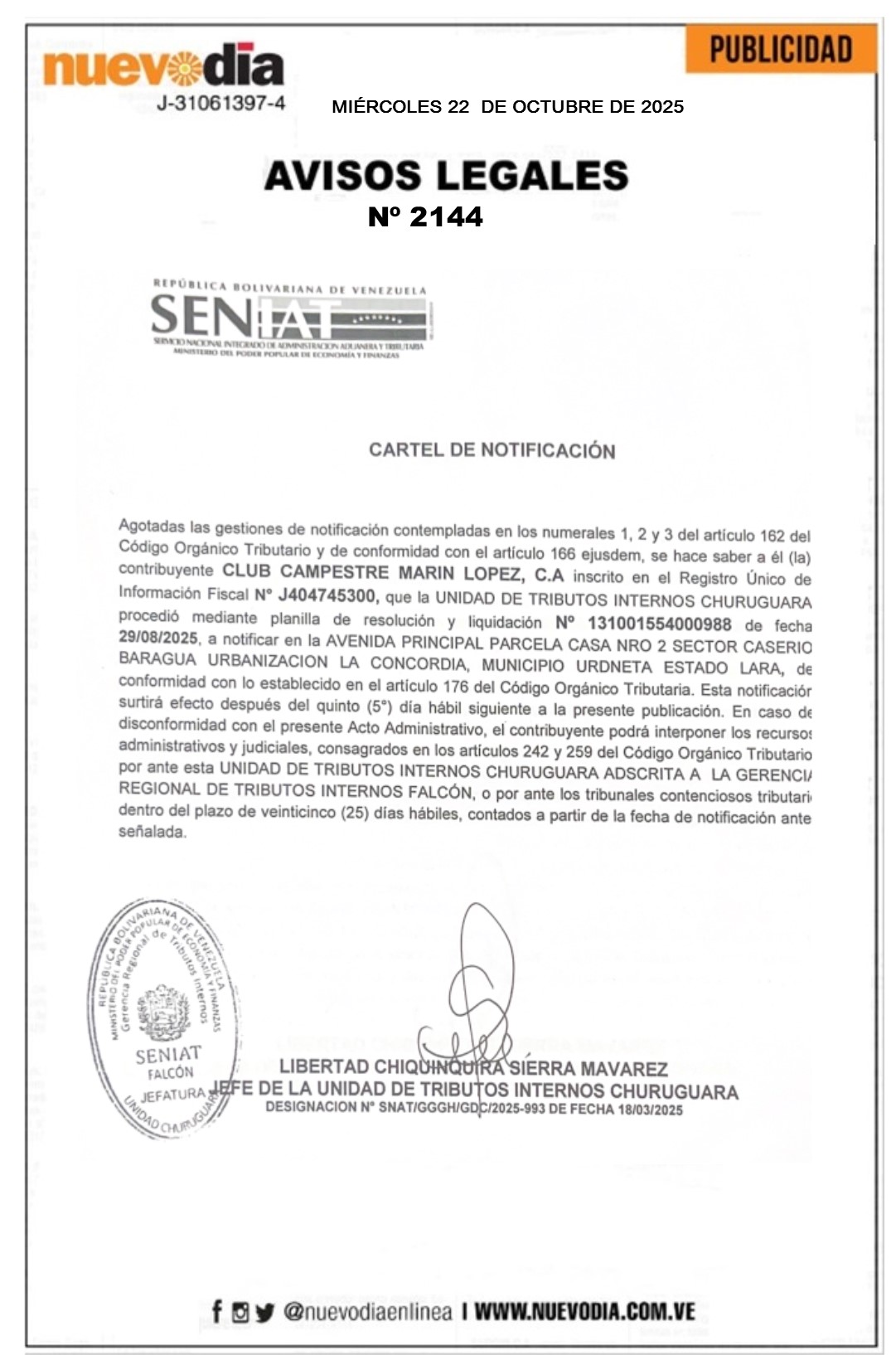 InicioPublicidadLegales PublicidadLegales Cartel de Notificación.Club Campestre Marín López,C.A. 22/10/2025 FacebookTwitterPinterestWhatsApp 2144. 22-10-2025 Cuota FacebookTwitterPinterestWhatsApp Artículo anteriorCartel de Notificación.El Gran Bodegón de Lozada, C.A.Artículo siguienteCartel de Notificación.Inversiones Mirco Sur, C.A. Mercadeo NuevoDia Noticias Relacionadas Legales Cartel de Notificación.Automercado Virgen del Carmen, C.A. Legales Cartel de Notificación.Samor,C.A. Legales Cartel de Notificación.Agrototal 2019,C.A. Redes Sociales20,299FansMe gusta112,425SeguidoresSeguir4,600SuscriptoresSuscribirte Últimas noticias Destacadas PDVSA factura $ 11.700 millones en nueve meses por exportaciones petroleras Destacadas Trasladan fiesta de los santos a parroquias por gran cantidad de fieles (COMUNICADO) Cargar más