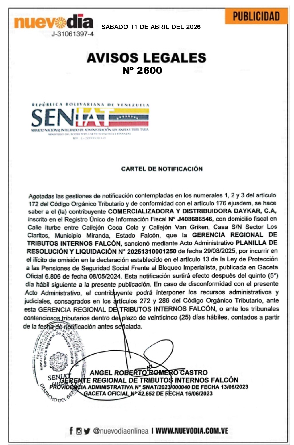 InicioPublicidadLegales PublicidadLegales Cartel de Notificación.Comercializadora y Distribuidora Daykar.C.A. 11/04/2026 FacebookTwitterPinterestWhatsApp 2600. 11-04-2026 Cuota FacebookTwitterPinterestWhatsApp Artículo anteriorCartel de Notificación.Asociación Coperativa 4M.R.L.Artículo siguienteCartel de Notificación.La Zulianita 1890.C.A. Mercadeo NuevoDia Noticias Relacionadas Legales Cartel de Notificación.Inversiones Jazmin.2019.C.A. Legales Cartel de Notificación.Copy Print.C.A. Legales Cartel de Notificación.Expert Inyectión Parts.C.A. Redes Sociales20,299FansMe gusta112,425SeguidoresSeguir4,600SuscriptoresSuscribirte Últimas noticias Destacadas Maestros entregan propuestas para recuperar ingreso económico al ministro Rodríguez Destacadas Así quedaron las tarifas de los peajes tras nuevo aumento Cargar más