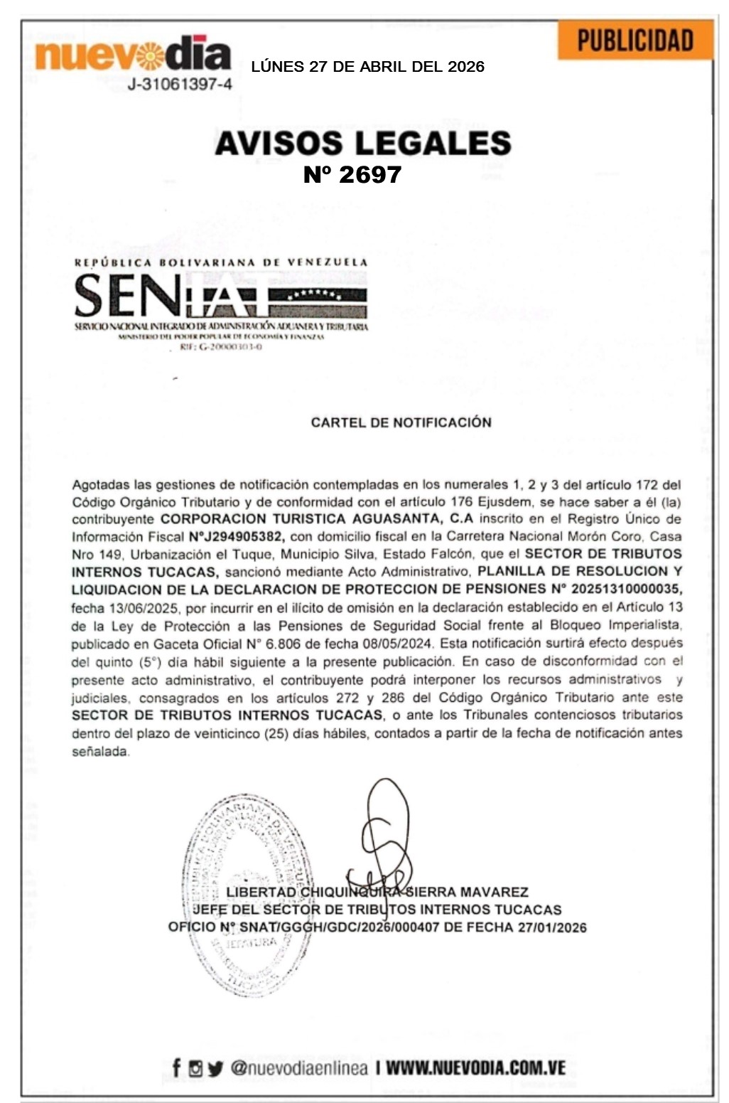 InicioPublicidadLegales PublicidadLegales Cartel de Notificación.Corporación Turística Aguasanta.C.A. 27/04/2026 FacebookTwitterPinterestWhatsApp 2697. 27-04-2026 Cuota FacebookTwitterPinterestWhatsApp Artículo anteriorCartel de Notificación.Piscinas Hidrotécnicas Tucacas.C.A.Artículo siguienteCartel de Notificación.Distribuidora El Gran Pollo 2017.C.A. Mercadeo NuevoDia Noticias Relacionadas Legales Cartel de Notificación.Agroganadera Cerro El León.C.A. Legales Cartel de Notificación.Distribuidora El Gran Pollo 2017.C.A. Legales Cartel de Notificación.Piscinas Hidrotécnicas Tucacas.C.A. Redes Sociales20,299FansMe gusta112,425SeguidoresSeguir4,600SuscriptoresSuscribirte Últimas noticias Destacadas Rechazan fin de la Ley de Amnistía anunciado por Rodríguez Destacadas Así transcurrió la reunión entre Delcy Rodríguez y Petro (FOTOS) Cargar más