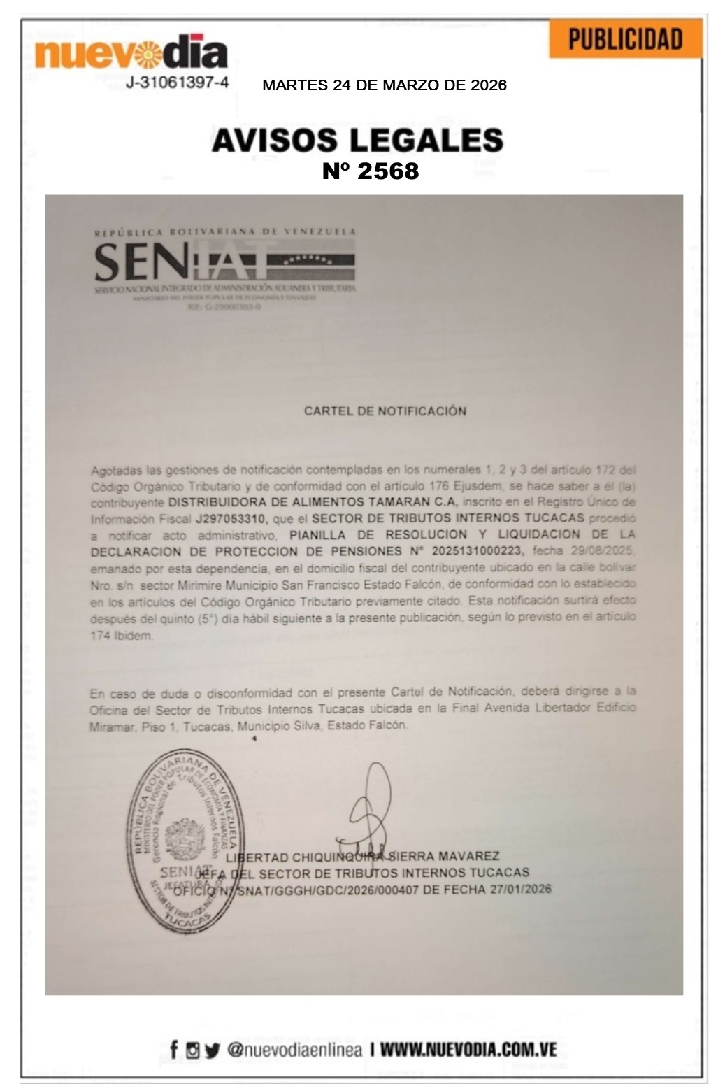 InicioPublicidadLegales PublicidadLegales Cartel de Notificación.Distribuidora de Alimentos Tamaran.C.A. 24/03/2026 FacebookTwitterPinterestWhatsApp 2568. 24-03-2026 Cuota FacebookTwitterPinterestWhatsApp Artículo anteriorCartel de Notificación.Trattoria Nonno Michele.C.A.Artículo siguienteEstados Unidos | Reportan una explosión en refinería de Texas Mercadeo NuevoDia Noticias Relacionadas Legales Convocatoria.Asamblea Ordinaria de Copropietarios.Condominio Residencial Alcatraz. Legales Convocatoria.Asamblea Ordinaria.Miembros Asociación Civil Universidad de Falcón. Legales Cartel de Notificación.Trattoria Nonno Michele.C.A. Redes Sociales20,299FansMe gusta112,425SeguidoresSeguir4,600SuscriptoresSuscribirte Últimas noticias Destacadas Falcón entre los estados más afectados por altas temperaturas Destacadas Reporte del Inameh: Lluvias y calor extremo hoy 24-Mar +DETALLES Cargar más