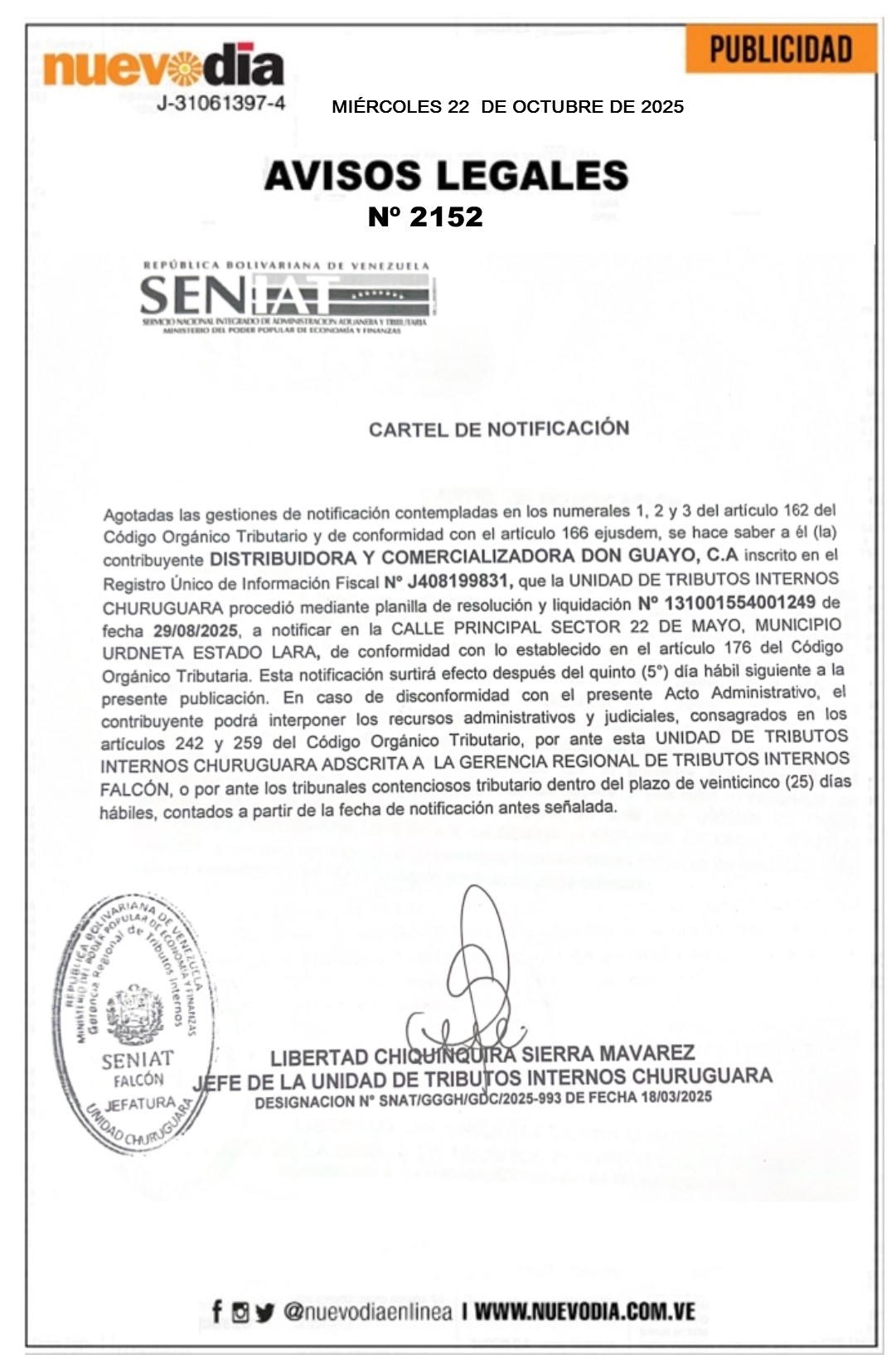 InicioPublicidadLegales PublicidadLegales Cartel de Notificación.Distribuidora y Comercializadora Don Guayo, C.A. 22/10/2025 FacebookTwitterPinterestWhatsApp 2152. 22-10-2025 Cuota FacebookTwitterPinterestWhatsApp Artículo anteriorCartel de Notificación.Comercializadora Dremilaj, C.A.Artículo siguienteCartel de Notificación.Inversiones Lara WJ, C.A. Mercadeo NuevoDia Noticias Relacionadas Legales Cartel de Notificación.Automercado Virgen del Carmen, C.A. Legales Cartel de Notificación.Samor,C.A. Legales Cartel de Notificación.Agrototal 2019,C.A. Redes Sociales20,299FansMe gusta112,425SeguidoresSeguir4,600SuscriptoresSuscribirte Últimas noticias Destacadas PDVSA factura $ 11.700 millones en nueve meses por exportaciones petroleras Destacadas Trasladan fiesta de los santos a parroquias por gran cantidad de fieles (COMUNICADO) Cargar más