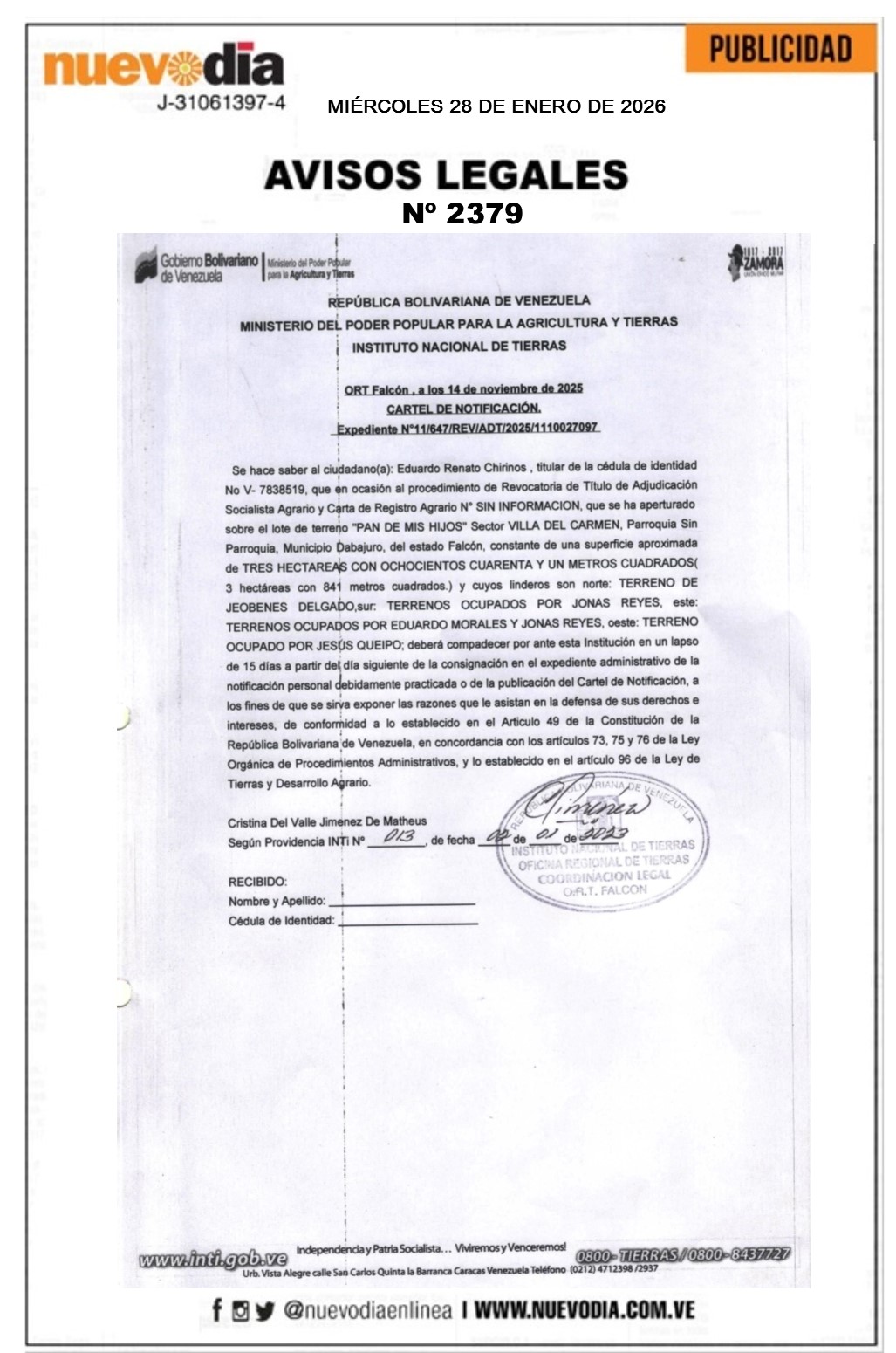 InicioPublicidadLegales PublicidadLegales Cartel de Notificación.Eduardo Renato Chirinos. 28/01/2026 FacebookTwitterPinterestWhatsApp 2379. 28-01-2026 Cuota FacebookTwitterPinterestWhatsApp Artículo anterior«Libertad o muerte»: la advertencia de Petro a TrumpArtículo siguienteMiguel Cabrera y Delcy Rodríguez en recorrido por la UCV +VIDEO Mercadeo NuevoDia Noticias Relacionadas Legales Edicto.Luís Ramón Lugo García. Legales Edicto.Armando José Coronado Medina. Legales Edicto.Antonio José Chirino Lugo y Jorge Federico Chirinos Lugo. Redes Sociales20,299FansMe gusta112,425SeguidoresSeguir4,600SuscriptoresSuscribirte Últimas noticias Destacadas Fanb conferirá insignias de comandante en jefe a Delcy Rodríguez Destacadas Miguel Cabrera y Delcy Rodríguez en recorrido por la UCV +VIDEO Cargar más
