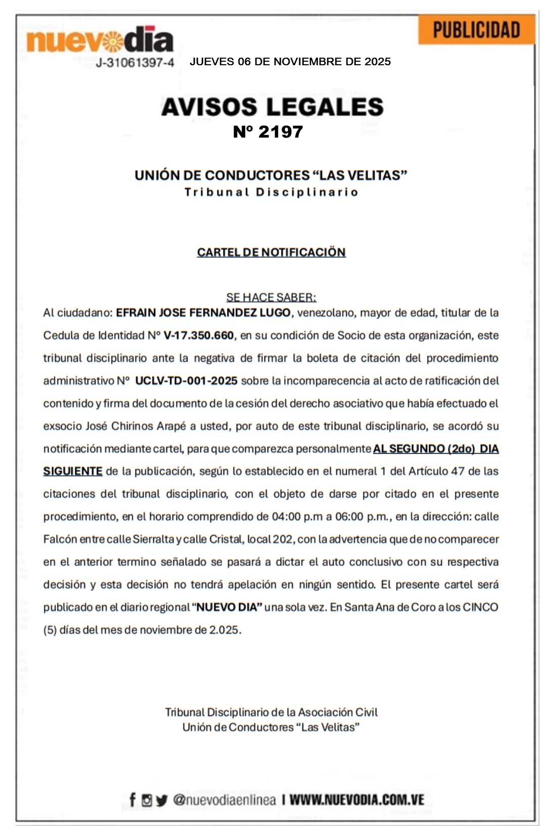 InicioPublicidadLegales PublicidadLegales Cartel de Notificación.Efrain José Fernández Lugo. 06/11/2025 FacebookTwitterPinterestWhatsApp 2197. 06-11-2025 Cuota FacebookTwitterPinterestWhatsApp Artículo anteriorPortada del 06 de noviembre de 2025Artículo siguiente6- Nov | Hoy el precio del dólar es este Mercadeo NuevoDia Noticias Relacionadas Legales Edicto.Lucia Caradonna de Maggi. Legales Cartel de Notificación.Comercializadora Damasco,C.A. Legales Convocatoria Asamblea General.Instituto Universitario de Tecnología José Leonardo Chirino(IUTJLCH). Redes Sociales20,299FansMe gusta112,425SeguidoresSeguir4,600SuscriptoresSuscribirte Últimas noticias Destacadas 6- Nov | Hoy el precio del dólar es este Destacadas Así avanza el camino a los altares de monseñor Felipe Rincón González Cargar más