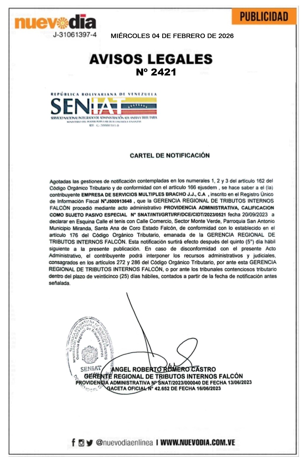InicioPublicidadLegales PublicidadLegales Cartel de Notificación.Empresa de Servicios Multiples Bracho J.J.C.A. 04/02/2026 FacebookTwitterPinterestWhatsApp 2421. 04-02-2026 Cuota FacebookTwitterPinterestWhatsApp Artículo anteriorCartel de Notificación.Carlos Eduardo Rodríguez.Artículo siguienteCartel de Notificación.Edimar María Rosales Marín (Inversiones Edistylo.F.P). Mercadeo NuevoDia Noticias Relacionadas Legales Cartel de Notificación.Procesadora y Distribuidora Medina González.C.A. Legales Cartel de Notificación.Marbiel Antonio Toyo Hernández(Inversiones M.M. de Marbiel Toyo Hernández). Legales Cartel de Notificación.Inversiones Clam.C.A. Redes Sociales20,299FansMe gusta112,425SeguidoresSeguir4,600SuscriptoresSuscribirte Últimas noticias Destacadas CEV espera un debate inclusivo de la Ley de Amnistía Destacadas Min-Educación prohíbe a planteles exigir aportes económicos y disfraces costosos para Carnaval Cargar más