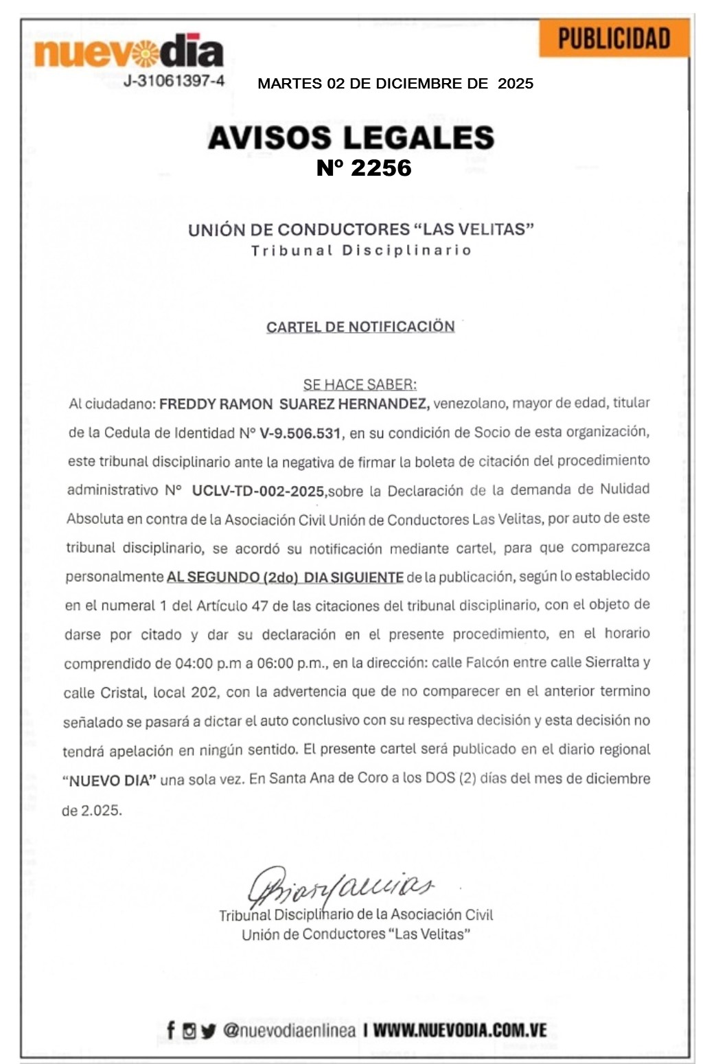 InicioPublicidadLegales PublicidadLegales Cartel de Notificación.Freddy Ramón Suarez Hernández. 02/12/2025 FacebookTwitterPinterestWhatsApp 2256. 02-12-2025 Cuota FacebookTwitterPinterestWhatsApp Artículo anteriorLatam Colombia suspendió ruta Bogotá-CaracasArtículo siguientePiden investigar muerte de joven en vuelco, esto dice su mamá Mercadeo NuevoDia Noticias Relacionadas Legales Resolución de Imposición de Sanción.Inversiones Crisro RCE.C.A. Legales Edicto.Nemesio del Carmen Rivero Marrufo. Legales Edicto.José Gregorio Loyo Leal. Redes Sociales20,299FansMe gusta112,425SeguidoresSeguir4,600SuscriptoresSuscribirte Últimas noticias Destacadas Designación de nuevos líderes PSUV 2025 reconfigura estructura Destacadas Conoce el precio del dólar en Venezuela para hoy 2-Dic Cargar más
