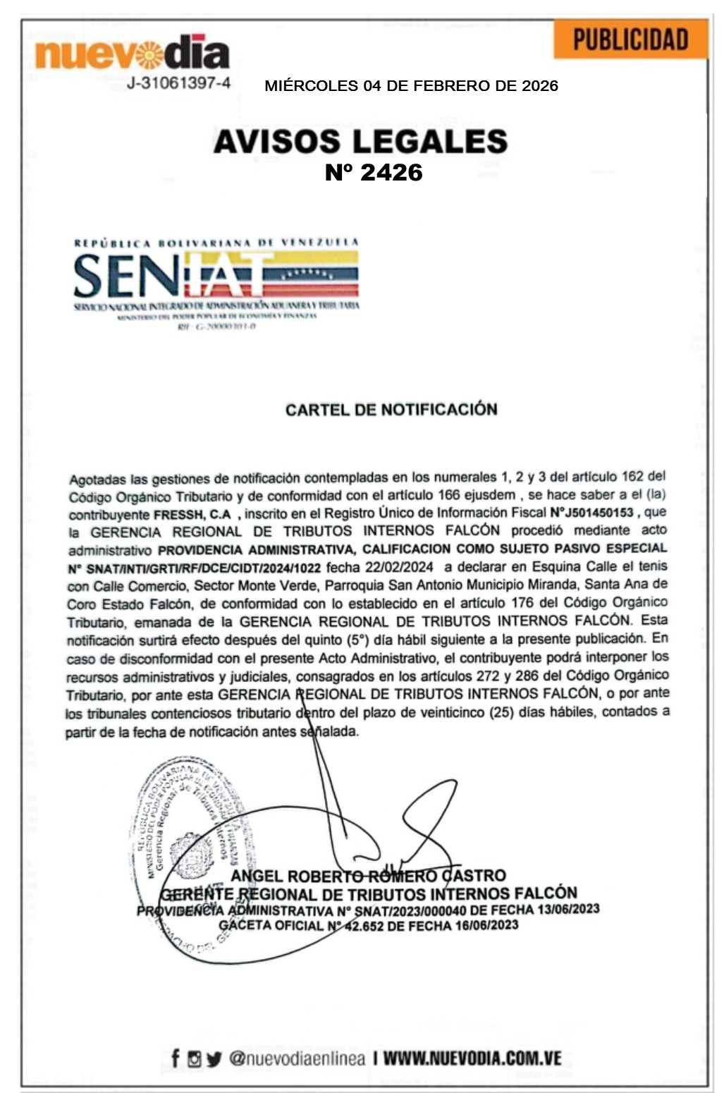 InicioPublicidadLegales PublicidadLegales Cartel de Notificación.Fressh.C.A. 04/02/2026 FacebookTwitterPinterestWhatsApp 2426. 04-02-2026 Cuota FacebookTwitterPinterestWhatsApp Artículo anteriorCartel de Notificación.Inversiones y Suministros CZ 2020.C.A.Artículo siguienteCartel de Notificación.Transcui.C.A. Mercadeo NuevoDia Noticias Relacionadas Legales Cartel de Notificación.Procesadora y Distribuidora Medina González.C.A. Legales Cartel de Notificación.Marbiel Antonio Toyo Hernández(Inversiones M.M. de Marbiel Toyo Hernández). Legales Cartel de Notificación.Inversiones Clam.C.A. Redes Sociales20,299FansMe gusta112,425SeguidoresSeguir4,600SuscriptoresSuscribirte Últimas noticias Destacadas Extraoficial | Alex Saab y Raúl Gorrín habrían sido detenidos este 4-Feb Destacadas CEV espera un debate inclusivo de la Ley de Amnistía Cargar más