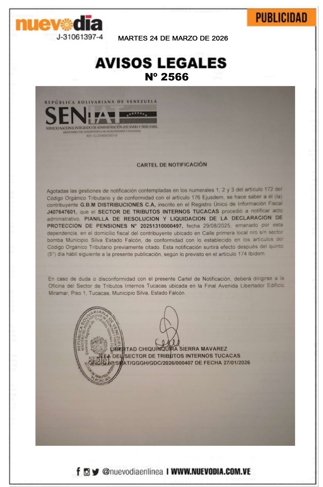 InicioPublicidadLegales PublicidadLegales Cartel de Notificación.G.B.M.Distribuciones.C.A. 24/03/2026 FacebookTwitterPinterestWhatsApp 2566. 24-03-2026 Cuota FacebookTwitterPinterestWhatsApp Artículo anteriorCartel de Notificación.Minimarket Los Compadres 68.C.A.Artículo siguienteColombia | Accidente aéreo dejó 66 fallecidos y 57 sobrevivientes Mercadeo NuevoDia Noticias Relacionadas Legales Convocatoria.Asamblea Ordinaria de Copropietarios.Condominio Residencial Alcatraz. Legales Convocatoria.Asamblea Ordinaria.Miembros Asociación Civil Universidad de Falcón. Legales Cartel de Notificación.Distribuidora de Alimentos Tamaran.C.A. Redes Sociales20,299FansMe gusta112,425SeguidoresSeguir4,600SuscriptoresSuscribirte Últimas noticias Destacadas Falcón entre los estados más afectados por altas temperaturas Destacadas Reporte del Inameh: Lluvias y calor extremo hoy 24-Mar +DETALLES Cargar más