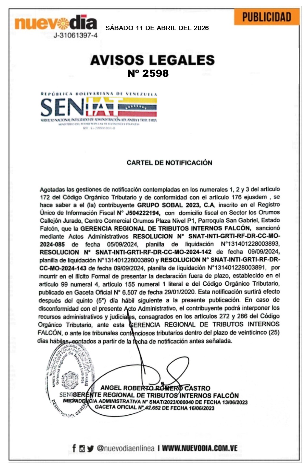 InicioPublicidadLegales PublicidadLegales Cartel de Notificación.Grupo Sobal 2023.C.A. 11/04/2026 FacebookTwitterPinterestWhatsApp 2598. 11-04-2026 Cuota FacebookTwitterPinterestWhatsApp Artículo anteriorCartel de Notificación.Lucky Pesquería.C.A.Artículo siguienteCartel de Notificación.Asociación Coperativa 4M.R.L. Mercadeo NuevoDia Noticias Relacionadas Legales Cartel de Notificación.Expert Inyectión Parts.C.A. Legales Cartel de Notificación.Remiveca Inversiones.C.A. Legales Cartel de Notificación.Inversiones F.S.R.C.A. Charcutería La Franqueza. Redes Sociales20,299FansMe gusta112,425SeguidoresSeguir4,600SuscriptoresSuscribirte Últimas noticias Destacadas Maestros entregan propuestas para recuperar ingreso económico al ministro Rodríguez Destacadas Así quedaron las tarifas de los peajes tras nuevo aumento Cargar más