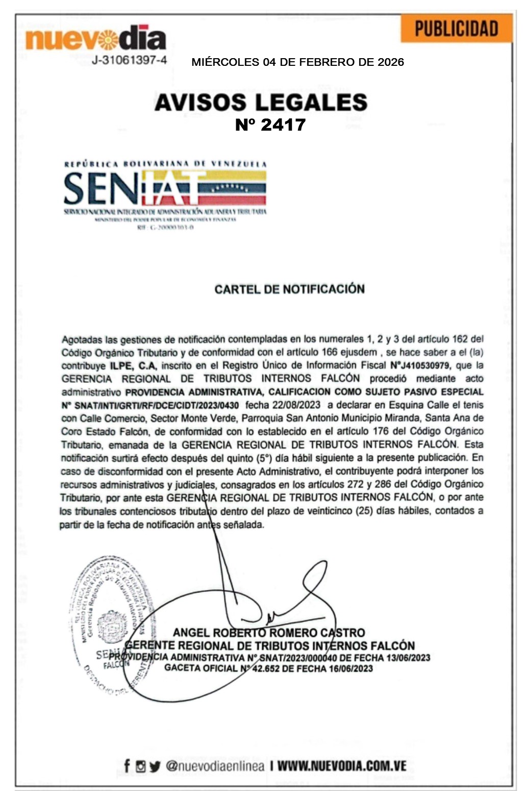 InicioPublicidadLegales PublicidadLegales Cartel de Notificación.Ilpe.C.A. 04/02/2026 FacebookTwitterPinterestWhatsApp 2417. 04-02-2026 Cuota FacebookTwitterPinterestWhatsApp Artículo anteriorCartel de Notificación.Tour Operadora Todariquiba.S.A.Artículo siguienteCartel de Notificación.Inversiones Bioagua J&L.C.A. Mercadeo NuevoDia Noticias Relacionadas Legales Cartel de Notificación.Procesadora y Distribuidora Medina González.C.A. Legales Cartel de Notificación.Marbiel Antonio Toyo Hernández(Inversiones M.M. de Marbiel Toyo Hernández). Legales Cartel de Notificación.Inversiones Clam.C.A. Redes Sociales20,299FansMe gusta112,425SeguidoresSeguir4,600SuscriptoresSuscribirte Últimas noticias Destacadas CEV espera un debate inclusivo de la Ley de Amnistía Destacadas Min-Educación prohíbe a planteles exigir aportes económicos y disfraces costosos para Carnaval Cargar más