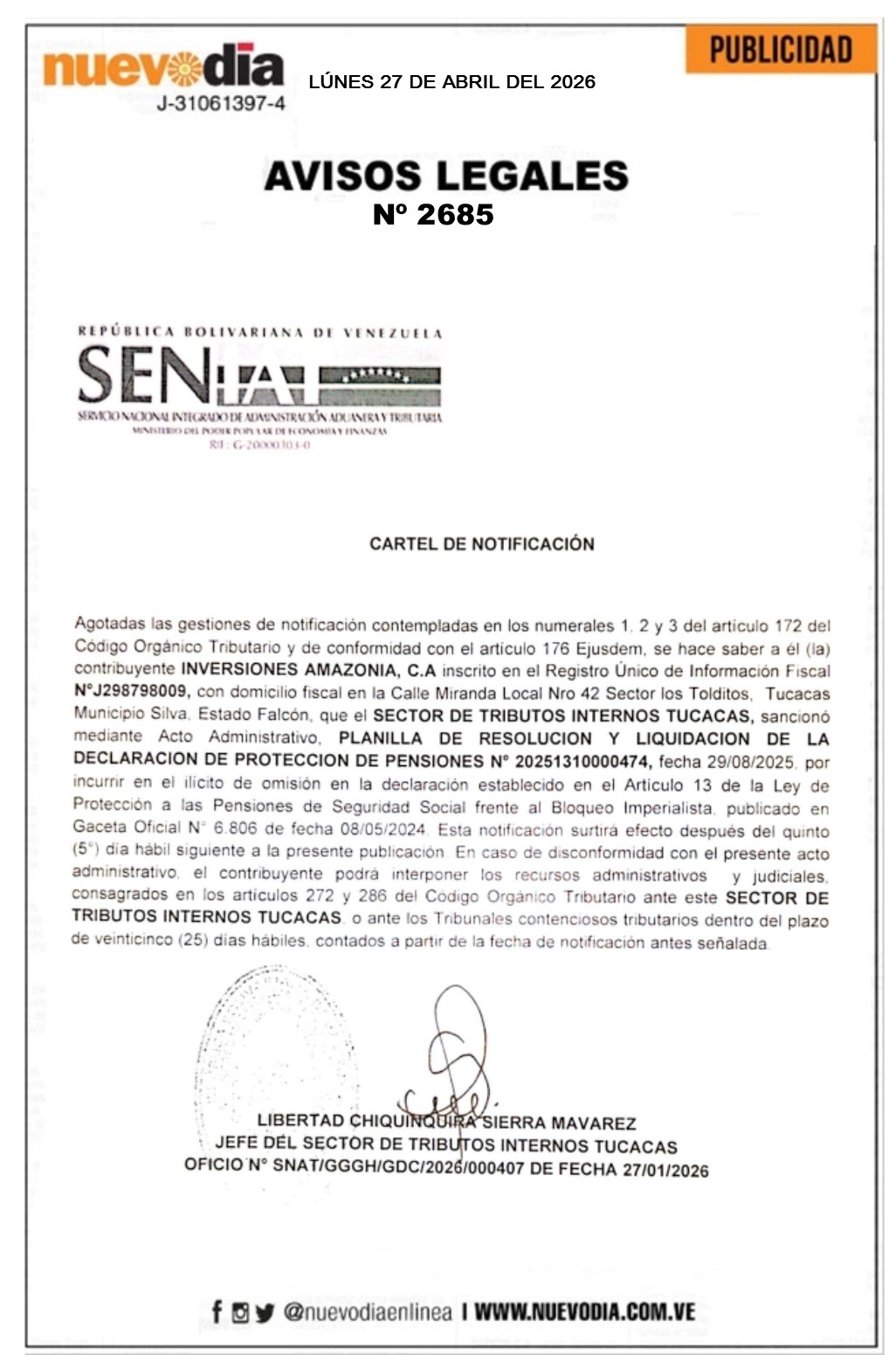 InicioPublicidadLegales PublicidadLegales Cartel de Notificación.Inversiones Amazonia.C.A. 27/04/2026 FacebookTwitterPinterestWhatsApp 2685. 27-04-2026 Cuota FacebookTwitterPinterestWhatsApp Artículo anteriorCartel de Notificación.Agropecuaria Valromi.C.A.Artículo siguienteCartel de Notificación.Barquisimeto Vidrio y Aluminio.C.A. Mercadeo NuevoDia Noticias Relacionadas Legales Cartel de Notificación.Agroganadera Cerro El León.C.A. Legales Cartel de Notificación.Distribuidora El Gran Pollo 2017.C.A. Legales Cartel de Notificación.Corporación Turística Aguasanta.C.A. Redes Sociales20,299FansMe gusta112,425SeguidoresSeguir4,600SuscriptoresSuscribirte Últimas noticias Destacadas Rechazan fin de la Ley de Amnistía anunciado por Rodríguez Destacadas Así transcurrió la reunión entre Delcy Rodríguez y Petro (FOTOS) Cargar más