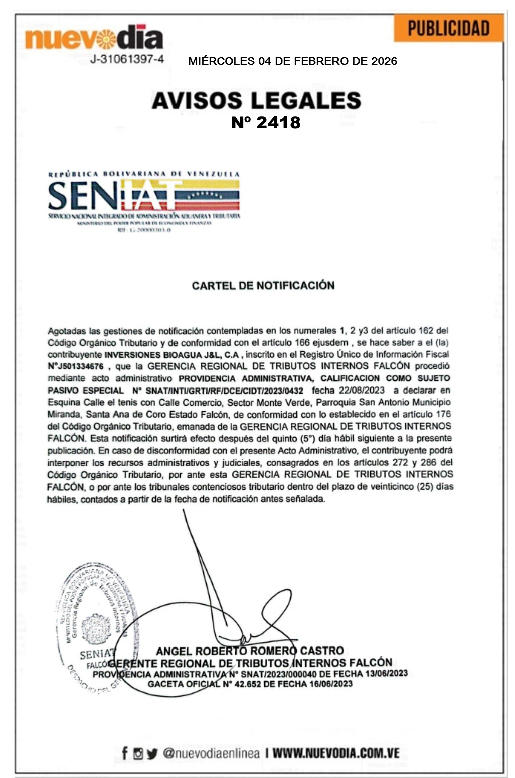 InicioPublicidadLegales PublicidadLegales Cartel de Notificación.Inversiones Bioagua J&L.C.A. 04/02/2026 FacebookTwitterPinterestWhatsApp 2418. 04-02-2026 Cuota FacebookTwitterPinterestWhatsApp Artículo anteriorCartel de Notificación.Ilpe.C.A.Artículo siguienteCartel de Notificación.Liberpan 2021.C.A. Mercadeo NuevoDia Noticias Relacionadas Legales Cartel de Notificación.Procesadora y Distribuidora Medina González.C.A. Legales Cartel de Notificación.Marbiel Antonio Toyo Hernández(Inversiones M.M. de Marbiel Toyo Hernández). Legales Cartel de Notificación.Inversiones Clam.C.A. Redes Sociales20,299FansMe gusta112,425SeguidoresSeguir4,600SuscriptoresSuscribirte Últimas noticias Destacadas CEV espera un debate inclusivo de la Ley de Amnistía Destacadas Min-Educación prohíbe a planteles exigir aportes económicos y disfraces costosos para Carnaval Cargar más
