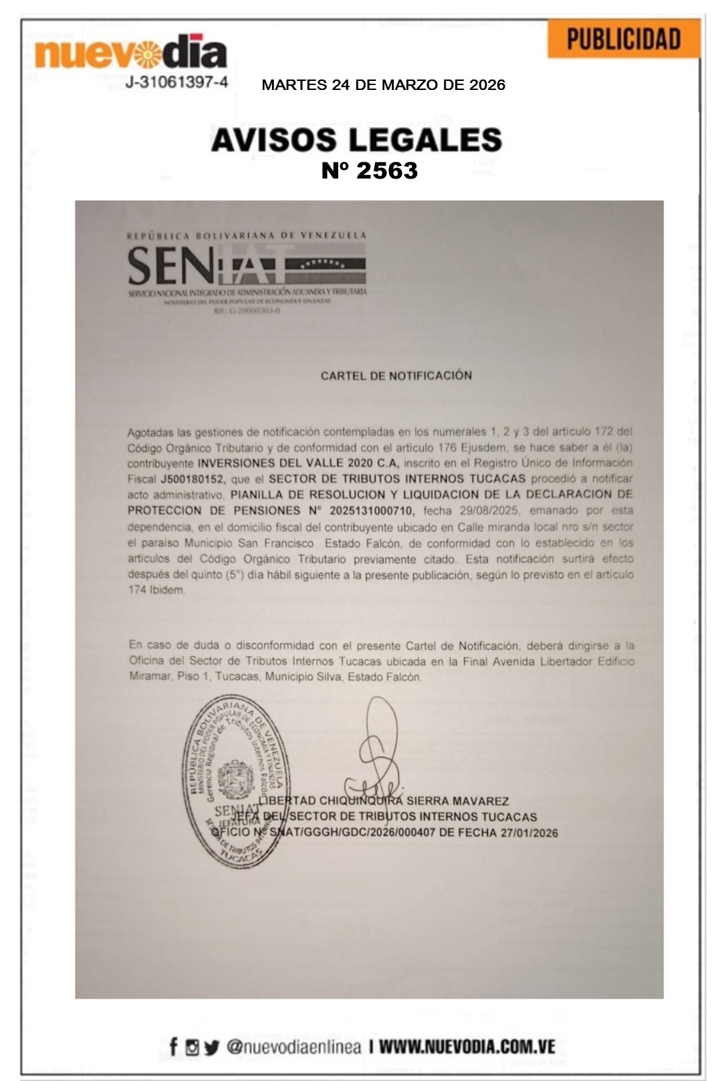 InicioPublicidadLegales PublicidadLegales Cartel de Notificación.Inversiones del Valle 2020.C.A. 24/03/2026 FacebookTwitterPinterestWhatsApp 2563. 24-03-2026 Cuota FacebookTwitterPinterestWhatsApp Artículo anteriorCartel de Notificación.Inversiones Luistodomas.C.A.Artículo siguienteCartel de Notificación.Supermarket De Angelo.C.A. Mercadeo NuevoDia Noticias Relacionadas Legales Convocatoria.Asamblea Ordinaria de Copropietarios.Condominio Residencial Alcatraz. Legales Convocatoria.Asamblea Ordinaria.Miembros Asociación Civil Universidad de Falcón. Legales Cartel de Notificación.Distribuidora de Alimentos Tamaran.C.A. Redes Sociales20,299FansMe gusta112,425SeguidoresSeguir4,600SuscriptoresSuscribirte Últimas noticias Destacadas Falcón entre los estados más afectados por altas temperaturas Destacadas Reporte del Inameh: Lluvias y calor extremo hoy 24-Mar +DETALLES Cargar más