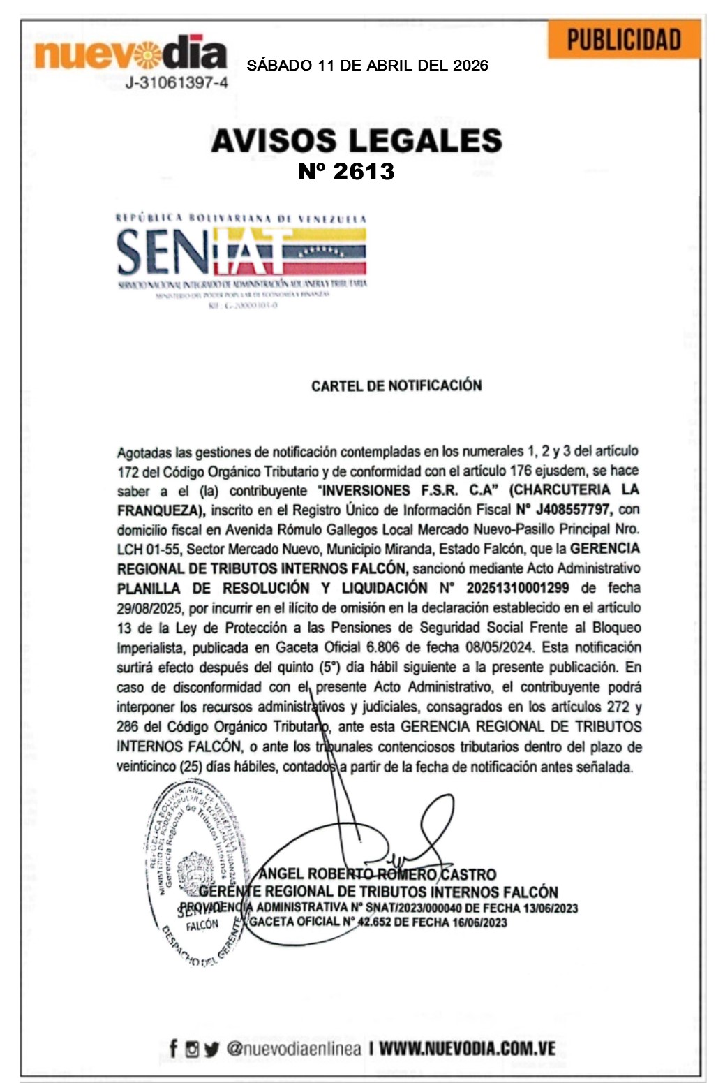 InicioPublicidadLegales PublicidadLegales Cartel de Notificación.Inversiones F.S.R.C.A. Charcutería La Franqueza. 11/04/2026 FacebookTwitterPinterestWhatsApp 2613. 11-04-2026 Cuota FacebookTwitterPinterestWhatsApp Artículo anteriorCartel de Notificación.Inversiones Rayan 2013.C.A.Artículo siguienteCartel de Notificación.Remiveca Inversiones.C.A. Mercadeo NuevoDia Noticias Relacionadas Legales Cartel de Notificación.Inversiones Jazmin.2019.C.A. Legales Cartel de Notificación.Copy Print.C.A. Legales Cartel de Notificación.Expert Inyectión Parts.C.A. Redes Sociales20,299FansMe gusta112,425SeguidoresSeguir4,600SuscriptoresSuscribirte Últimas noticias Destacadas Jorge Arreaza: Ley de Amnistía ha beneficiado a más de 8.000 personas Destacadas Nuevo fiscal general se compromete a defender los derechos humanos Cargar más