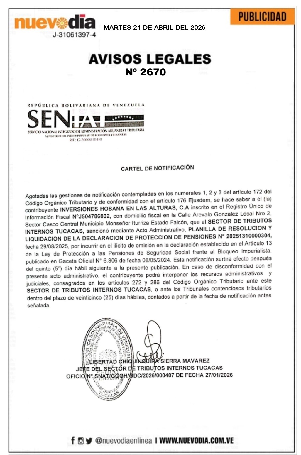 InicioPublicidadLegales PublicidadLegales Cartel de Notificación.Inversiones Hosana en las Alturas.C.A. 21/04/2026 FacebookTwitterPinterestWhatsApp 2670. 21-04-2026 Cuota FacebookTwitterPinterestWhatsApp Artículo anteriorCartel de Notificación.Fumiclean Falcón.C.A.Artículo siguienteCartel de Notificación.Inversiones Luismarys 207.C.A. Mercadeo NuevoDia Noticias Relacionadas Legales Cartel de Notificación.Inversiones Luismarys 207.C.A. Legales Cartel de Notificación.Fumiclean Falcón.C.A. Legales Cartel de Notificación.Exferca Vigilancia 24.C.A. Redes Sociales20,299FansMe gusta112,425SeguidoresSeguir4,600SuscriptoresSuscribirte Últimas noticias Destacadas AN prepara selección del comité encargado de evaluar aspirantes a magistrados del TSJ Destacadas Jorge Arreaza: María Corina no aplica para ser beneficiada por la Ley de Amnistía Cargar más