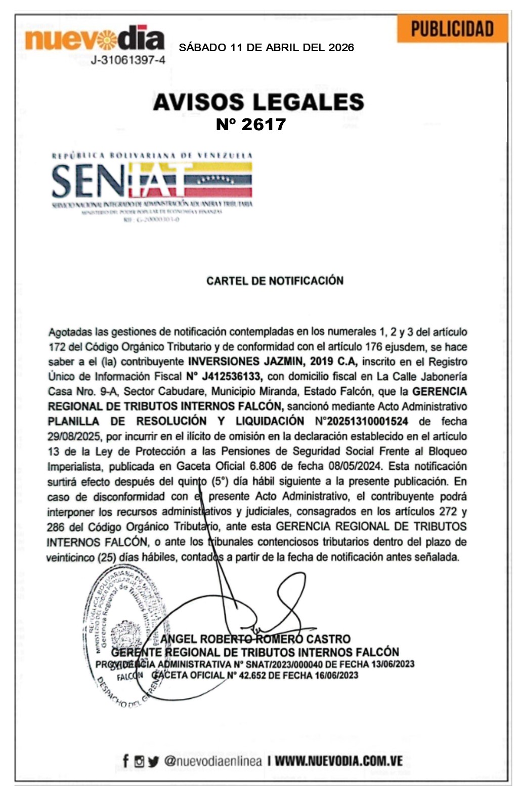 InicioPublicidadLegales PublicidadLegales Cartel de Notificación.Inversiones Jazmin.2019.C.A. 11/04/2026 FacebookTwitterPinterestWhatsApp 2617. 11-04-2026 Cuota FacebookTwitterPinterestWhatsApp Artículo anteriorUnexee gradúa primera promoción de TSU en Redes Eléctricas en FalcónArtículo siguienteNuevo fiscal general se compromete a defender los derechos humanos Mercadeo NuevoDia Noticias Relacionadas Legales Cartel de Notificación.Copy Print.C.A. Legales Cartel de Notificación.Expert Inyectión Parts.C.A. Legales Cartel de Notificación.Remiveca Inversiones.C.A. Redes Sociales20,299FansMe gusta112,425SeguidoresSeguir4,600SuscriptoresSuscribirte Últimas noticias Destacadas Jorge Arreaza: Ley de Amnistía ha beneficiado a más de 8.000 personas Destacadas Nuevo fiscal general se compromete a defender los derechos humanos Cargar más