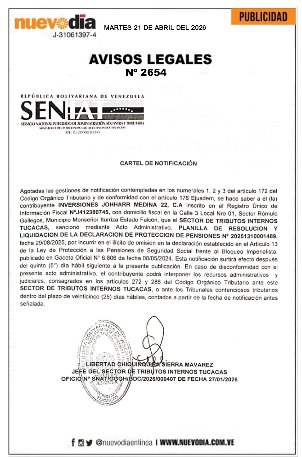 InicioPublicidadLegales PublicidadLegales Cartel de Notificación.Inversiones Johharr Medina 22.C.A. 21/04/2026 FacebookTwitterPinterestWhatsApp 2654. 21-04-2026 Cuota FacebookTwitterPinterestWhatsApp Artículo anteriorJorge Arreaza: María Corina no aplica para ser beneficiada por la Ley de AmnistíaArtículo siguienteCartel de Citación.Servicios y Mantenimientos Sacuragua.C.A. Mercadeo NuevoDia Noticias Relacionadas Legales Cartel de Notificación.Inversiones Luismarys 207.C.A. Legales Cartel de Notificación.Inversiones Hosana en las Alturas.C.A. Legales Cartel de Notificación.Fumiclean Falcón.C.A. Redes Sociales20,299FansMe gusta112,425SeguidoresSeguir4,600SuscriptoresSuscribirte Últimas noticias Destacadas AN prepara selección del comité encargado de evaluar aspirantes a magistrados del TSJ Destacadas Jorge Arreaza: María Corina no aplica para ser beneficiada por la Ley de Amnistía Cargar más