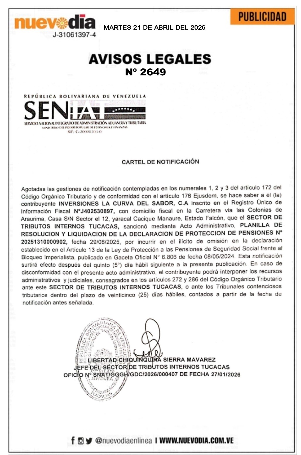 InicioPublicidadLegales PublicidadLegales Cartel de Notificación.Inversiones La Curva del Sabor.C.A. 21/04/2026 FacebookTwitterPinterestWhatsApp 2649. 21-04-2026 Cuota FacebookTwitterPinterestWhatsApp Artículo anteriorCartel de Notificación.UPF Bodega La Matica.Artículo siguienteCartel de Notificación.Inversiones M&L 2016.C.A. Mercadeo NuevoDia Noticias Relacionadas Legales Cartel de Notificación.Brisas de Chichiriviche.C.A. Legales Cartel de Notificación.KBA Styles Moda.C.A. Legales Cartel de Notificación.Grupo Arteinmueble.C.A. Redes Sociales20,299FansMe gusta112,425SeguidoresSeguir4,600SuscriptoresSuscribirte Últimas noticias Destacadas AN prepara selección del comité encargado de evaluar aspirantes a magistrados del TSJ Destacadas Jorge Arreaza: María Corina no aplica para ser beneficiada por la Ley de Amnistía Cargar más