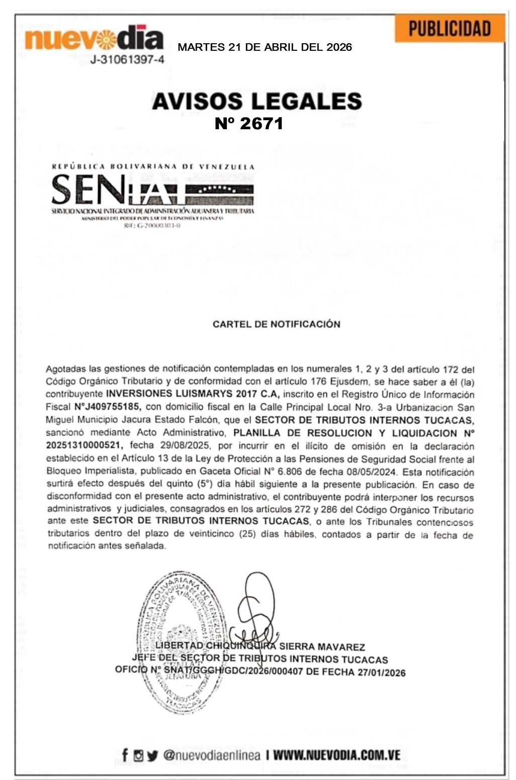Cartel de Notificación.Inversiones Luismarys 207.C.A.
