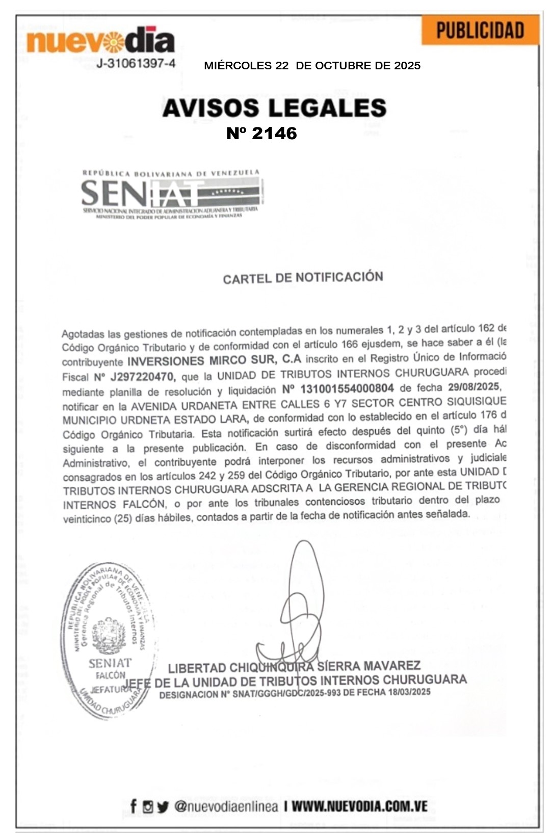 InicioPublicidadLegales PublicidadLegales Cartel de Notificación.Inversiones Mirco Sur, C.A. 22/10/2025 FacebookTwitterPinterestWhatsApp 2146. 22-10-2025 Cuota FacebookTwitterPinterestWhatsApp Artículo anteriorCartel de Notificación.Club Campestre Marín López,C.A.Artículo siguienteCartel de Notificación.Inversiones El Yon 2016,C.A. Mercadeo NuevoDia Noticias Relacionadas Legales Cartel de Notificación.Automercado Virgen del Carmen, C.A. Legales Cartel de Notificación.Samor,C.A. Legales Cartel de Notificación.Agrototal 2019,C.A. Redes Sociales20,299FansMe gusta112,425SeguidoresSeguir4,600SuscriptoresSuscribirte Últimas noticias Destacadas PDVSA factura $ 11.700 millones en nueve meses por exportaciones petroleras Destacadas Trasladan fiesta de los santos a parroquias por gran cantidad de fieles (COMUNICADO) Cargar más
