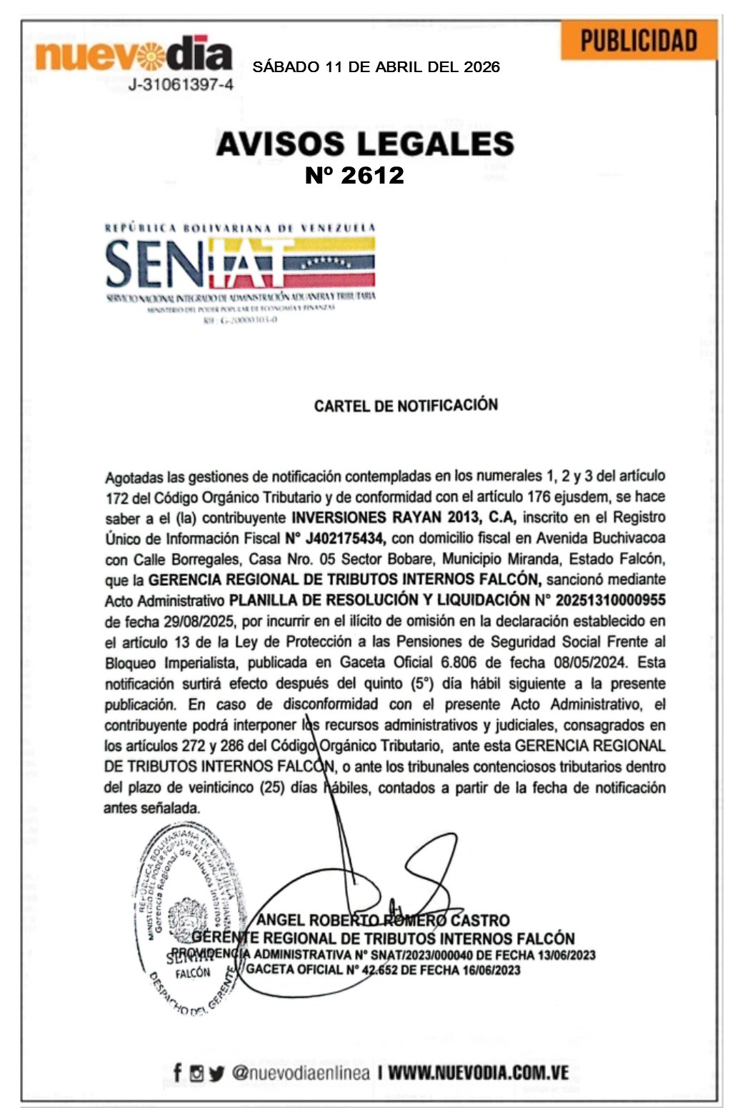 InicioPublicidadLegales PublicidadLegales Cartel de Notificación.Inversiones Rayan 2013.C.A. 11/04/2026 FacebookTwitterPinterestWhatsApp 2612. 11-04-2026 Cuota FacebookTwitterPinterestWhatsApp Artículo anteriorCartel de Notificación.Inversiones Rixagnis.C.A.Artículo siguienteCartel de Notificación.Inversiones F.S.R.C.A. Charcutería La Franqueza. Mercadeo NuevoDia Noticias Relacionadas Legales Cartel de Notificación.Inversiones Jazmin.2019.C.A. Legales Cartel de Notificación.Copy Print.C.A. Legales Cartel de Notificación.Expert Inyectión Parts.C.A. Redes Sociales20,299FansMe gusta112,425SeguidoresSeguir4,600SuscriptoresSuscribirte Últimas noticias Destacadas Jorge Arreaza: Ley de Amnistía ha beneficiado a más de 8.000 personas Destacadas Nuevo fiscal general se compromete a defender los derechos humanos Cargar más