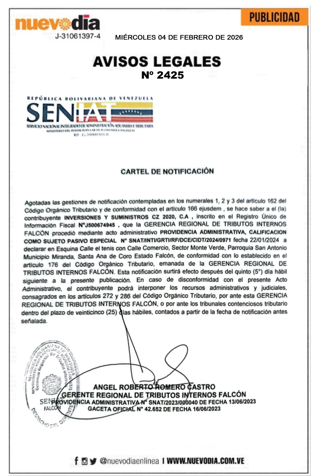 InicioPublicidadLegales PublicidadLegales Cartel de Notificación.Inversiones y Suministros CZ 2020.C.A. 04/02/2026 FacebookTwitterPinterestWhatsApp 2425. 04-02-2025 Cuota FacebookTwitterPinterestWhatsApp Artículo anteriorCartel de Notificación.Inversiones El Cubiro.Artículo siguienteCartel de Notificación.Fressh.C.A. Mercadeo NuevoDia Noticias Relacionadas Legales Cartel de Notificación.Procesadora y Distribuidora Medina González.C.A. Legales Cartel de Notificación.Marbiel Antonio Toyo Hernández(Inversiones M.M. de Marbiel Toyo Hernández). Legales Cartel de Notificación.Inversiones Clam.C.A. Redes Sociales20,299FansMe gusta112,425SeguidoresSeguir4,600SuscriptoresSuscribirte Últimas noticias Destacadas Este 4-Feb llegaron 273 connacionales desde EE.UU. Destacadas Extraoficial | Alex Saab y Raúl Gorrín habrían sido detenidos este 4-Feb Cargar más