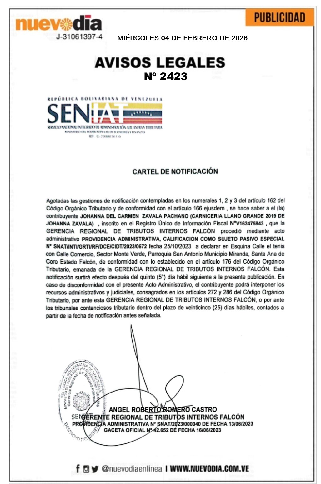 InicioPublicidadLegales PublicidadLegales Cartel de Notificación.Johanna del Carmen Zavala Pachano(Carnicería LLano Grande 2019 de Johanna Zavala). 04/02/2026 FacebookTwitterPinterestWhatsApp 2423. 04-02-2026 Cuota FacebookTwitterPinterestWhatsApp Artículo anteriorCartel de Notificación.Edimar María Rosales Marín (Inversiones Edistylo.F.P).Artículo siguienteCartel de Notificación.Inversiones El Cubiro. Mercadeo NuevoDia Noticias Relacionadas Legales Acta Asamblea Extraordinaria.Gmaaz Industrial de Alimentos.C.A. Legales Edicto.Virgilio José Osteicoechea Martínez,Yaritza Osteicoechea Petit y José Virgilio Osteicoechea Petit. Legales Edicto.Francisco D’sales Sandoval Rodríguez. Redes Sociales20,299FansMe gusta112,425SeguidoresSeguir4,600SuscriptoresSuscribirte Últimas noticias Destacadas Renuncian: Fiscal General y Defensor del Pueblo presentan sus cartas ante la Asamblea Nacional Destacadas Polvo del Sahara atraviesa Venezuela y afecta el clima y la visibilidad Cargar más