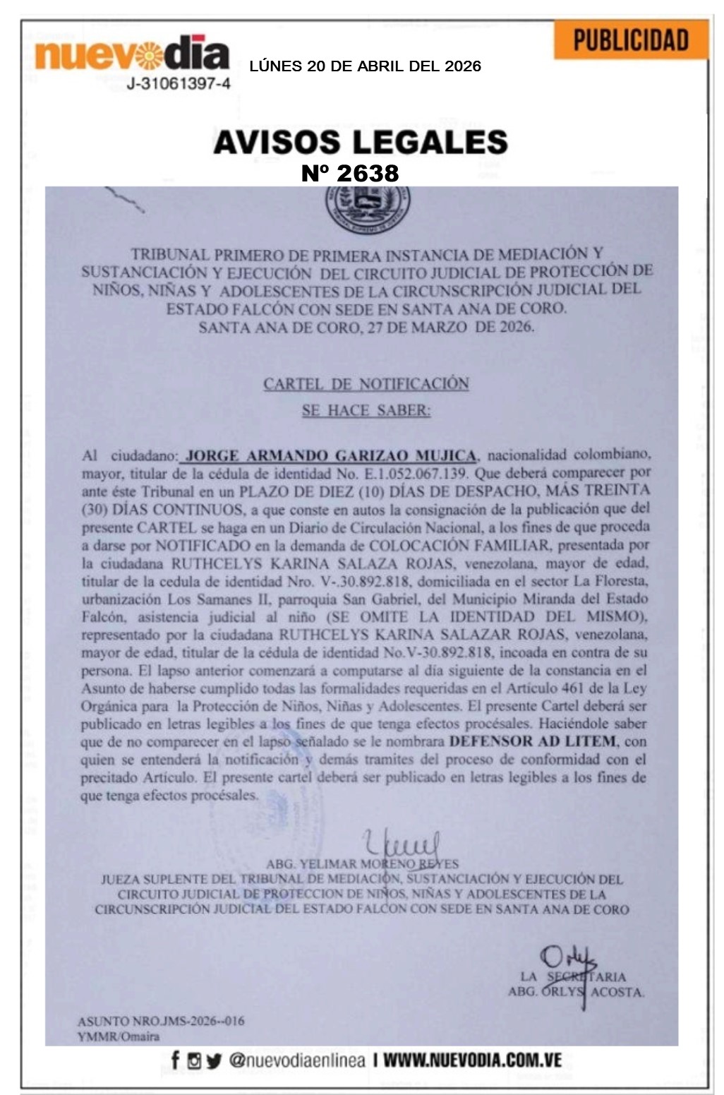 InicioPublicidadLegales PublicidadLegales Cartel de Notificación.Jorge Armando Garizao Mujica. 20/04/2026 FacebookTwitterPinterestWhatsApp 2638. 20-07-2026 Cuota FacebookTwitterPinterestWhatsApp Artículo anteriorSupervisan transformación de la Escuela «Manuel Antonio García» de CabureArtículo siguienteTsunami provocado por terremoto en Japón no afectará la costa de China Mercadeo NuevoDia Noticias Relacionadas Legales Edicto.Rafael Alejandro Gutiérrez Graterol. Legales Tercera Convocatoria.Asamblea Extraordinaria de Propietarios Condominio del Complejo Caribbean Marina & Beach Club. Legales Cartel de Citación.Marbella Guadalupe De Sousa Dávila. Redes Sociales20,299FansMe gusta112,425SeguidoresSeguir4,600SuscriptoresSuscribirte Últimas noticias Destacadas Cabello critica insultos contra Delcy Rodríguez, esto dijo Destacadas Presidente de Asobanca no ve conveniente dolarizar la economía Cargar más
