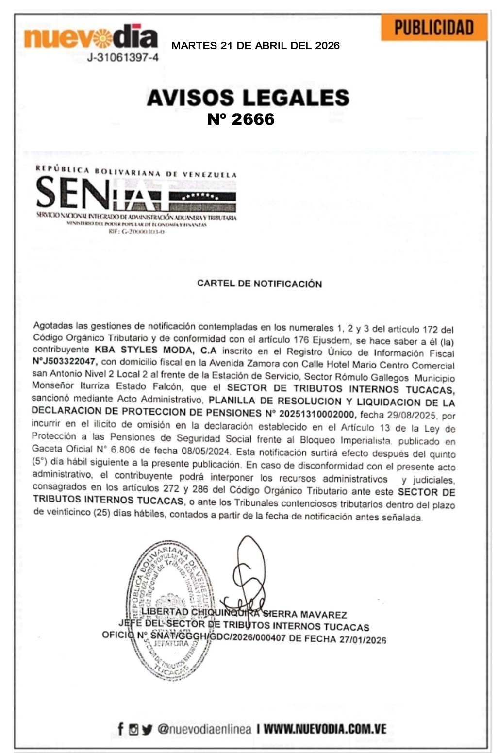 InicioPublicidadLegales PublicidadLegales Cartel de Notificación.KBA Styles Moda.C.A. 21/04/2026 FacebookTwitterPinterestWhatsApp 2666. 21-04-2026 Cuota FacebookTwitterPinterestWhatsApp Artículo anteriorAN prepara selección del comité encargado de evaluar aspirantes a magistrados del TSJArtículo siguienteCartel de Notificación.Brisas de Chichiriviche.C.A. Mercadeo NuevoDia Noticias Relacionadas Legales Cartel de Notificación.Inversiones Luismarys 207.C.A. Legales Cartel de Notificación.Inversiones Hosana en las Alturas.C.A. Legales Cartel de Notificación.Fumiclean Falcón.C.A. Redes Sociales20,299FansMe gusta112,425SeguidoresSeguir4,600SuscriptoresSuscribirte Últimas noticias Destacadas AN prepara selección del comité encargado de evaluar aspirantes a magistrados del TSJ Destacadas Jorge Arreaza: María Corina no aplica para ser beneficiada por la Ley de Amnistía Cargar más