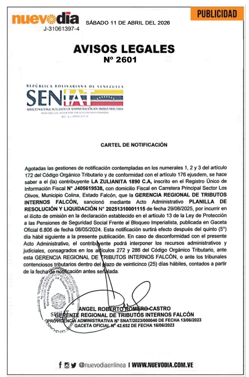InicioPublicidadLegales PublicidadLegales Cartel de Notificación.La Zulianita 1890.C.A. 11/04/2026 FacebookTwitterPinterestWhatsApp 2601. 11-04-2026 Cuota FacebookTwitterPinterestWhatsApp Artículo anteriorCartel de Notificación.Comercializadora y Distribuidora Daykar.C.A.Artículo siguienteCartel de Notificación.Humdelmor.C.A. Mercadeo NuevoDia Noticias Relacionadas Legales Cartel de Notificación.Inversiones Jazmin.2019.C.A. Legales Cartel de Notificación.Copy Print.C.A. Legales Cartel de Notificación.Expert Inyectión Parts.C.A. Redes Sociales20,299FansMe gusta112,425SeguidoresSeguir4,600SuscriptoresSuscribirte Últimas noticias Destacadas Maestros entregan propuestas para recuperar ingreso económico al ministro Rodríguez Destacadas Así quedaron las tarifas de los peajes tras nuevo aumento Cargar más