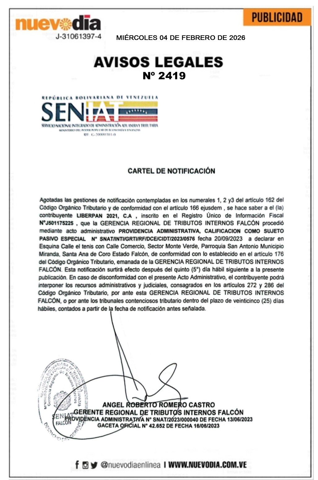 InicioPublicidadLegales PublicidadLegales Cartel de Notificación.Liberpan 2021.C.A. 04/02/2026 FacebookTwitterPinterestWhatsApp 2419. 04-02-2026 Cuota FacebookTwitterPinterestWhatsApp Artículo anteriorCartel de Notificación.Inversiones Bioagua J&L.C.A.Artículo siguienteCartel de Notificación.Carlos Eduardo Rodríguez. Mercadeo NuevoDia Noticias Relacionadas Legales Cartel de Notificación.Procesadora y Distribuidora Medina González.C.A. Legales Cartel de Notificación.Marbiel Antonio Toyo Hernández(Inversiones M.M. de Marbiel Toyo Hernández). Legales Cartel de Notificación.Inversiones Clam.C.A. Redes Sociales20,299FansMe gusta112,425SeguidoresSeguir4,600SuscriptoresSuscribirte Últimas noticias Destacadas CEV espera un debate inclusivo de la Ley de Amnistía Destacadas Min-Educación prohíbe a planteles exigir aportes económicos y disfraces costosos para Carnaval Cargar más