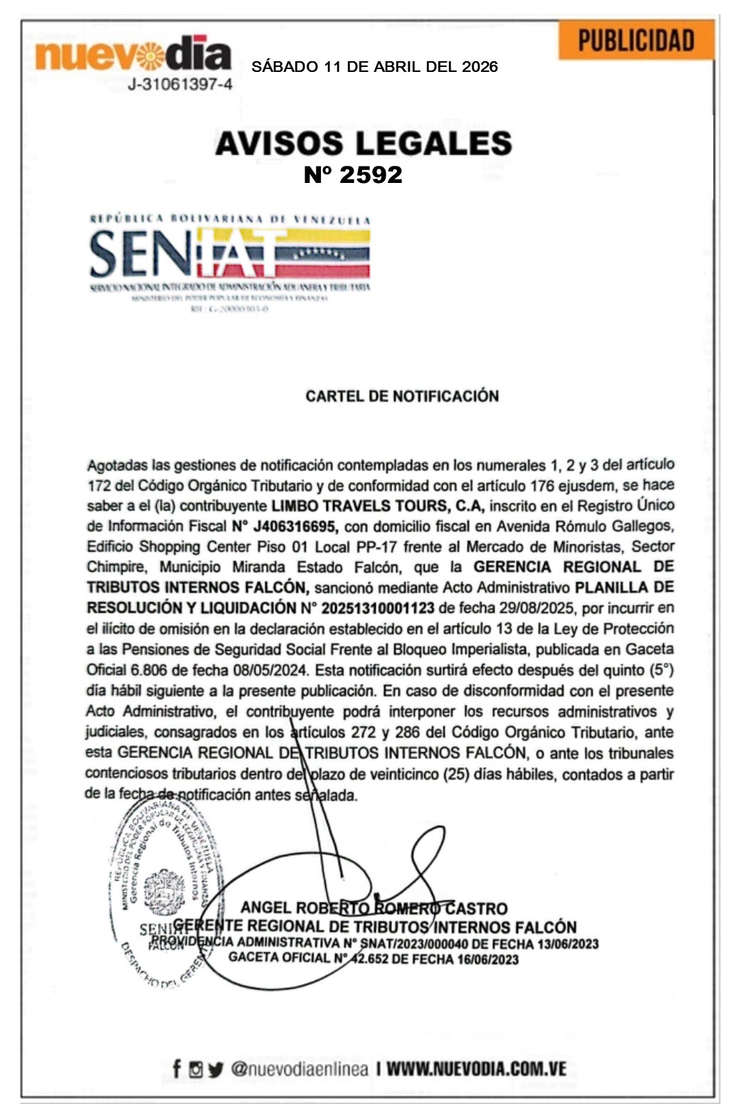 InicioPublicidadLegales PublicidadLegales Cartel de Notificación.Limbo Travels Tours.C.A. 11/04/2026 FacebookTwitterPinterestWhatsApp 2592. 11-04-2026 Cuota FacebookTwitterPinterestWhatsApp Artículo anteriorCartel de Notificación.Blofalsan.C.A.Artículo siguienteCartel de Notificación.Bodegón y Licorería El Cocuy.C.A. Mercadeo NuevoDia Noticias Relacionadas Legales Cartel de Notificación.Variedades Mamallija.C.A. Legales Cartel de Notificación.Inversiones Reyes Moreno.C.A. Legales Cartel de Notificación.Transporte Robert.C.A. Redes Sociales20,299FansMe gusta112,425SeguidoresSeguir4,600SuscriptoresSuscribirte Últimas noticias Destacadas Maestros entregan propuestas para recuperar ingreso económico al ministro Rodríguez Destacadas Así quedaron las tarifas de los peajes tras nuevo aumento Cargar más