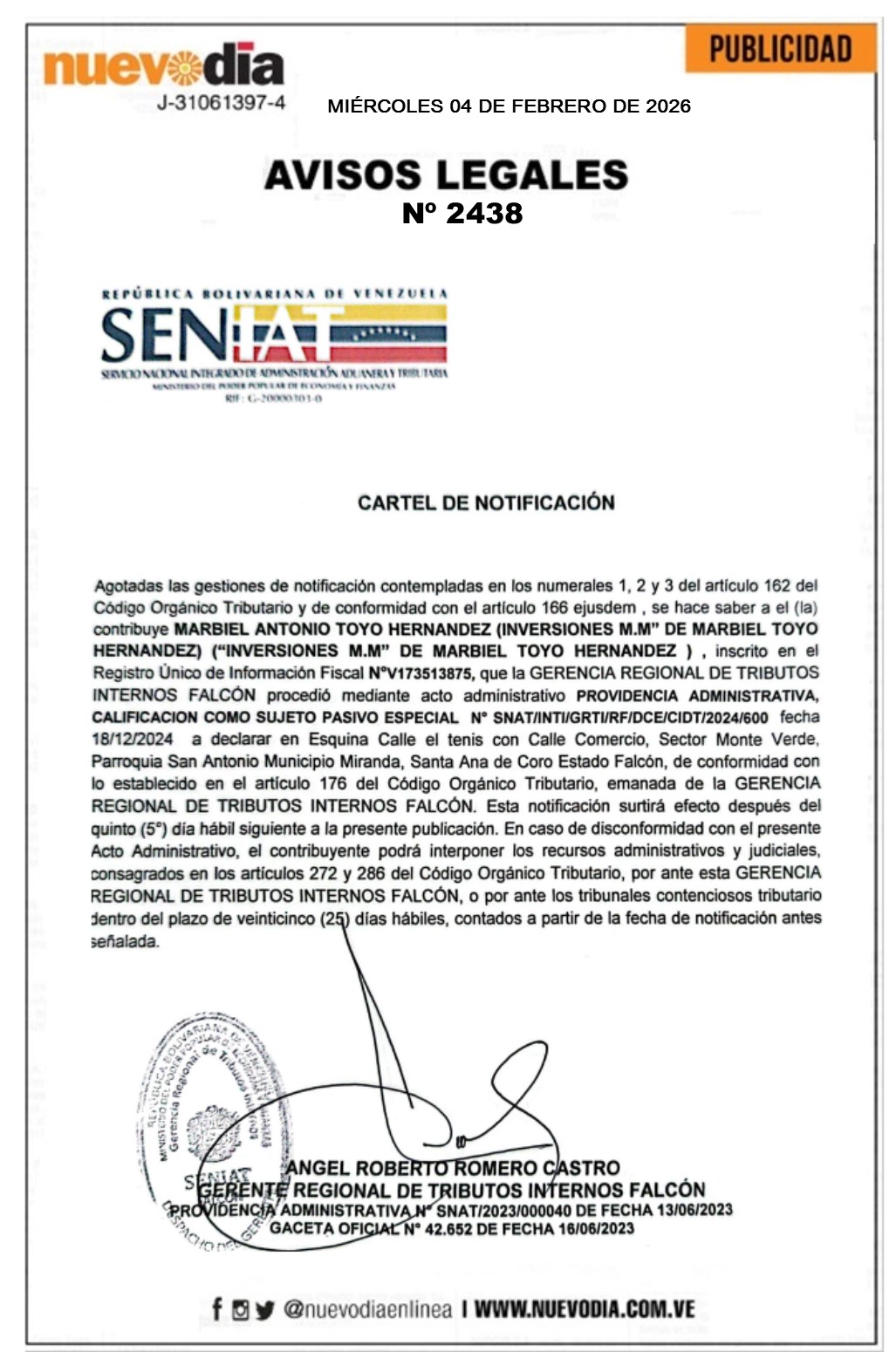 InicioPublicidadLegales PublicidadLegales Cartel de Notificación.Marbiel Antonio Toyo Hernández(Inversiones M.M. de Marbiel Toyo Hernández). 04/02/2026 FacebookTwitterPinterestWhatsApp 2438. 04-02-2026 Cuota FacebookTwitterPinterestWhatsApp Artículo anteriorCartel de Notificación.Inversiones Clam.C.A.Artículo siguienteCartel de Notificación.Procesadora y Distribuidora Medina González.C.A. Mercadeo NuevoDia Noticias Relacionadas Legales Cartel de Notificación.Procesadora y Distribuidora Medina González.C.A. Legales Cartel de Notificación.Inversiones Clam.C.A. Legales Cartel de Notificación.Aluvisa.S.A. Redes Sociales20,299FansMe gusta112,425SeguidoresSeguir4,600SuscriptoresSuscribirte Últimas noticias Destacadas Este 4-Feb llegaron 273 connacionales desde EE.UU. Destacadas Extraoficial | Alex Saab y Raúl Gorrín habrían sido detenidos este 4-Feb Cargar más