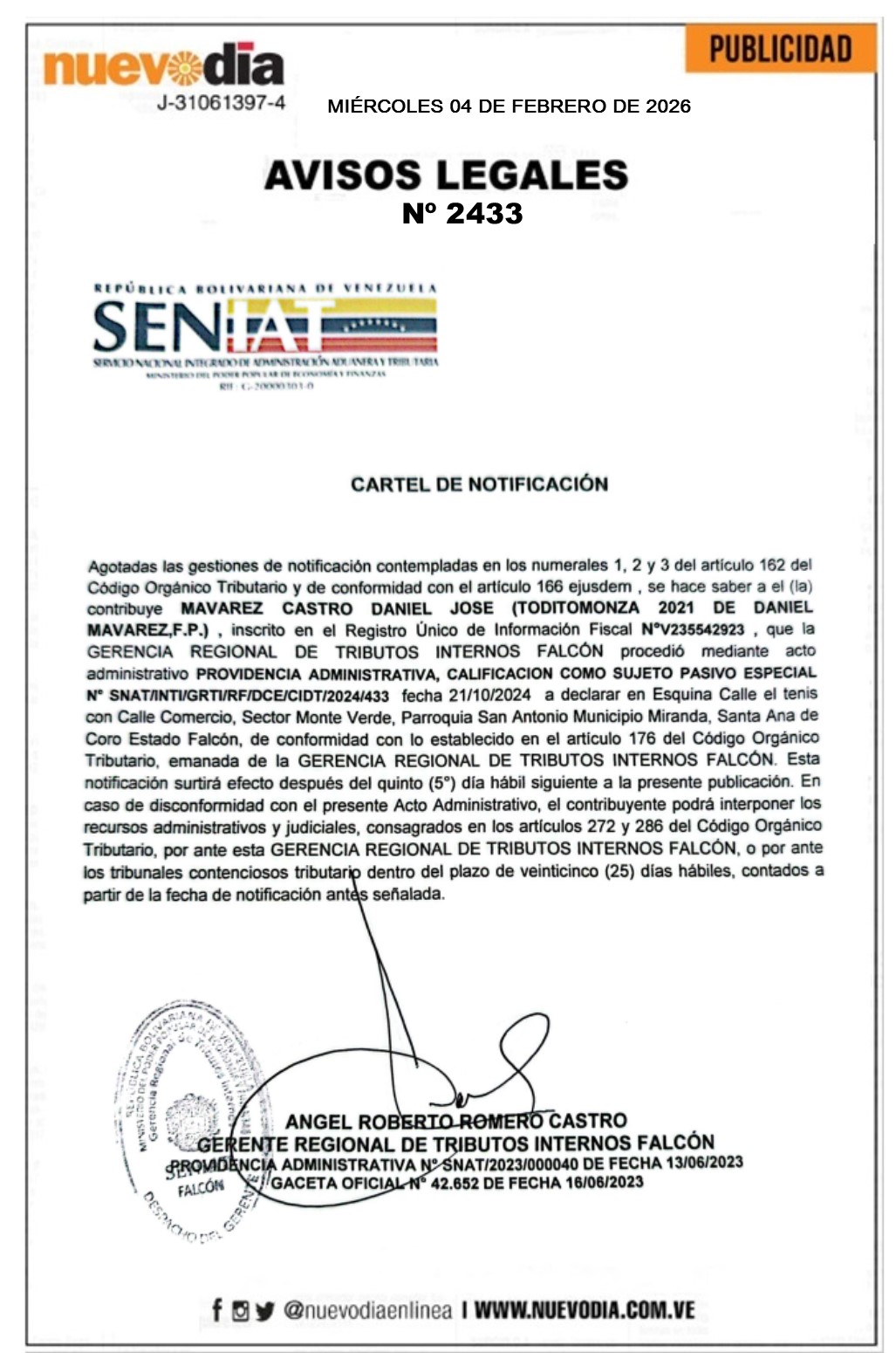 InicioPublicidadLegales PublicidadLegales Cartel de Notificación.Mavarez Castro Daniel José(Toditomonza 2021 de Daniel Mavarez.F.P). 04/02/2026 FacebookTwitterPinterestWhatsApp 2433. 04-02-2026 Cuota FacebookTwitterPinterestWhatsApp Artículo anteriorCartel de Notificación.Navarro Rodríguez María Virginia(Inversiones Quero Motor’s.F.C.).Artículo siguienteCartel de Notificación.Comercializadora y Distribuidora Elirock.C.A. Mercadeo NuevoDia Noticias Relacionadas Legales Cartel de Notificación.Procesadora y Distribuidora Medina González.C.A. Legales Cartel de Notificación.Marbiel Antonio Toyo Hernández(Inversiones M.M. de Marbiel Toyo Hernández). Legales Cartel de Notificación.Inversiones Clam.C.A. Redes Sociales20,299FansMe gusta112,425SeguidoresSeguir4,600SuscriptoresSuscribirte Últimas noticias Destacadas Este 4-Feb llegaron 273 connacionales desde EE.UU. Destacadas Extraoficial | Alex Saab y Raúl Gorrín habrían sido detenidos este 4-Feb Cargar más