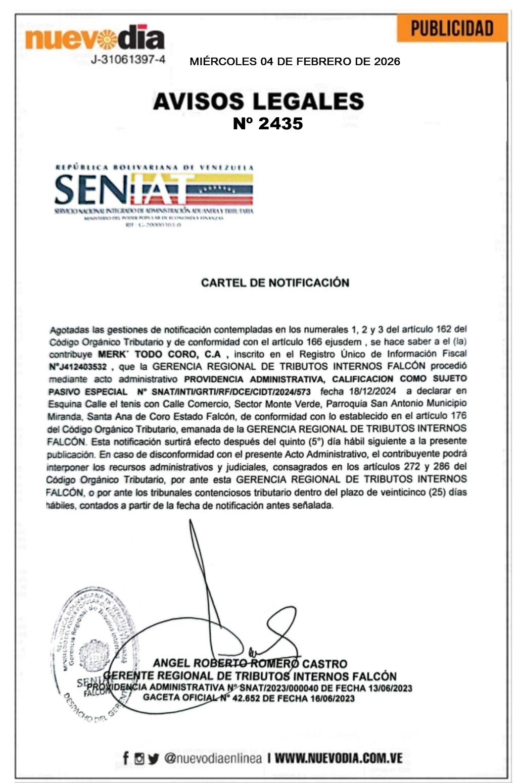 InicioPublicidadLegales PublicidadLegales Cartel de Notificación.Merk’ Todo Coro.C.A. 04/02/2026 FacebookTwitterPinterestWhatsApp 2435. 04-02-2026 Cuota FacebookTwitterPinterestWhatsApp Artículo anteriorCartel de Notificación.Comercializadora y Distribuidora Elirock.C.A.Artículo siguienteCartel de Notificación.Aluvisa.S.A. Mercadeo NuevoDia Noticias Relacionadas Legales Cartel de Notificación.Procesadora y Distribuidora Medina González.C.A. Legales Cartel de Notificación.Marbiel Antonio Toyo Hernández(Inversiones M.M. de Marbiel Toyo Hernández). Legales Cartel de Notificación.Inversiones Clam.C.A. Redes Sociales20,299FansMe gusta112,425SeguidoresSeguir4,600SuscriptoresSuscribirte Últimas noticias Destacadas Este 4-Feb llegaron 273 connacionales desde EE.UU. Destacadas Extraoficial | Alex Saab y Raúl Gorrín habrían sido detenidos este 4-Feb Cargar más