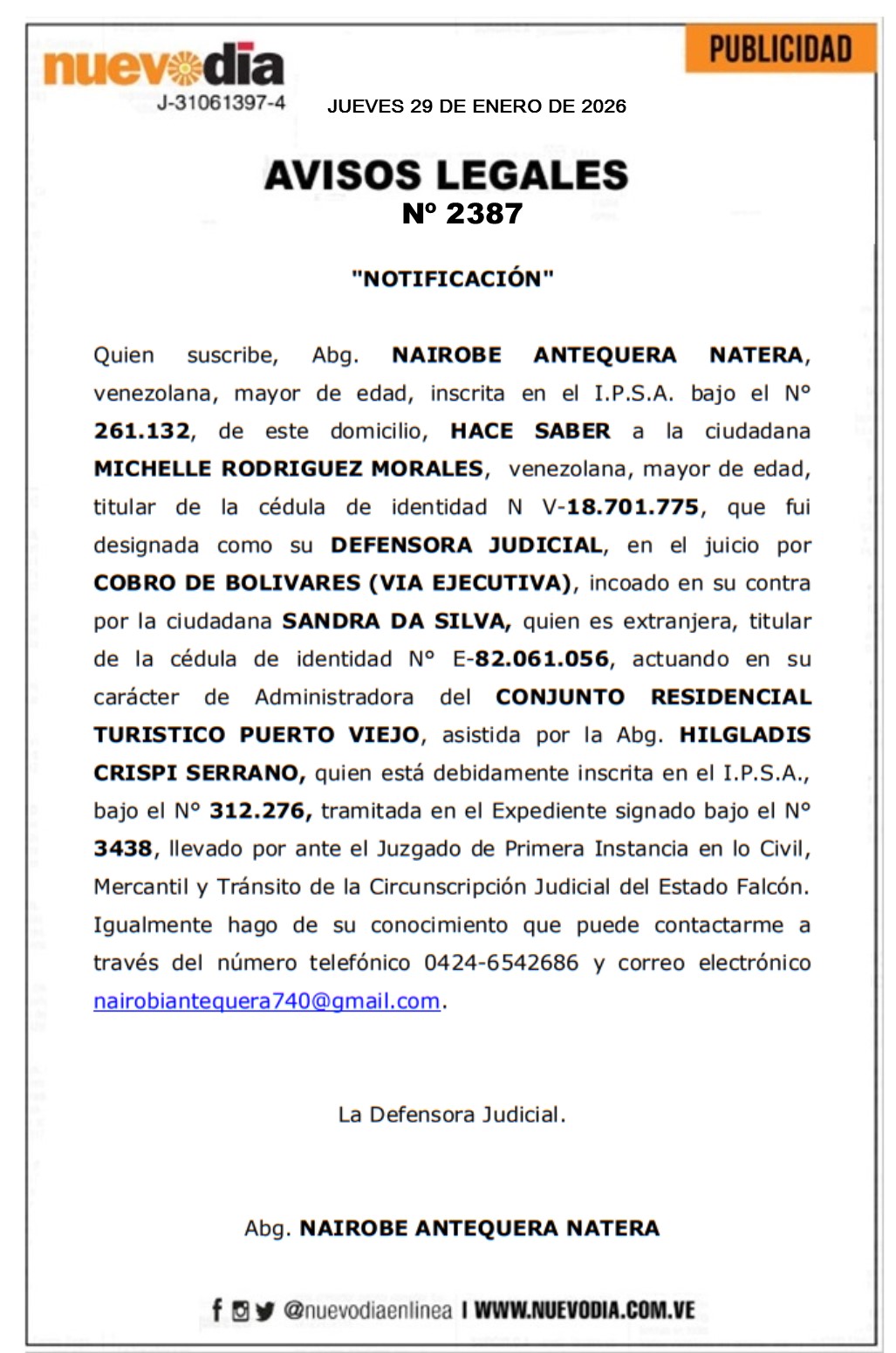 InicioPublicidadLegales PublicidadLegales Cartel de Notificación.Michelle Rodríguez Morales. 29/01/2026 FacebookTwitterPinterestWhatsApp 2387. 29-01-2026 Cuota FacebookTwitterPinterestWhatsApp Artículo anteriorVenezuela ya conoce rivales para el Mundial Fiba U17Artículo siguienteConsecomercio respalda mejoras salariales sin asfixiar al sector privado Mercadeo NuevoDia Noticias Relacionadas Legales Edicto.Rafael Angel Acosta Rivero. Legales Edicto.Miguel Segundo Nava. Legales Cartel de Citación.Maritza Guadalupe Lugo Flores. Redes Sociales20,299FansMe gusta112,425SeguidoresSeguir4,600SuscriptoresSuscribirte Últimas noticias Destacadas Consecomercio respalda mejoras salariales sin asfixiar al sector privado Destacadas Diosdado Cabello lanza advertencia a Venevisión| Lo que dijo Cargar más