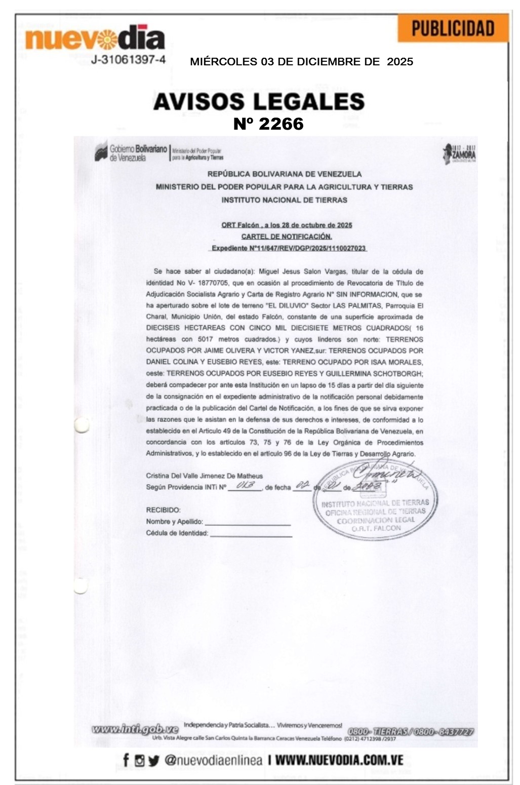 InicioPublicidadLegales PublicidadLegales Cartel de Notificación.Miguel Jesús Salón Vargas. 03/12/2025 FacebookTwitterPinterestWhatsApp 2266. 03-12-2025 Cuota FacebookTwitterPinterestWhatsApp Artículo anteriorUptag conferirá doctorado Honoris Causa a cinco baluartes de la cultura falconianaArtículo siguienteCapturado joven por violación en Boca de Aroa Mercadeo NuevoDia Noticias Relacionadas Legales Edicto.Nicolas María Meléndez Romero. Legales Edicto.Higinio de Jesús Castro Castro. Legales Convocatoria.Asamblea Extraordinaria de Accionistas.Serenos Montalban.C.A. Redes Sociales20,299FansMe gusta112,425SeguidoresSeguir4,600SuscriptoresSuscribirte Últimas noticias Destacadas AN repudia despojo de Citgo por parte de EE. UU. Destacadas Este es el precio del dólar hoy 3-Dic Cargar más
