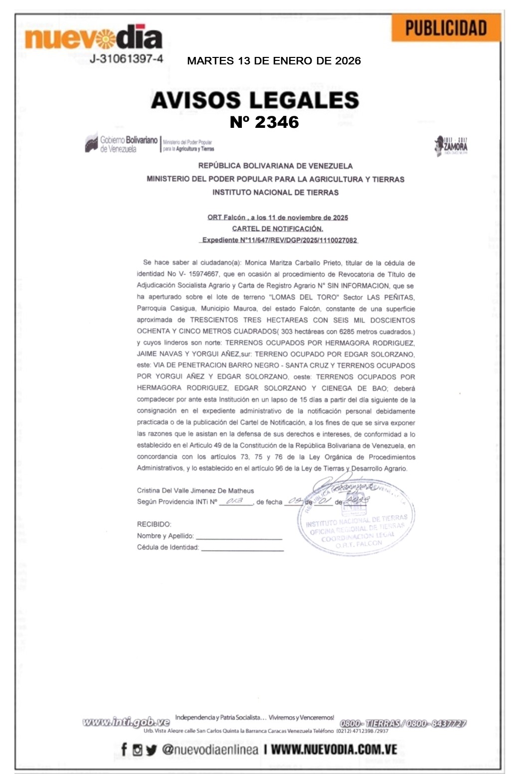 InicioPublicidadLegales PublicidadLegales Cartel de Notificación.Monica Maritza Carballo Prieto. 13/01/2026 FacebookTwitterPinterestWhatsApp 2346. 13-01-2026 Cuota FacebookTwitterPinterestWhatsApp Artículo anteriorDelcy Rodríguez y diplomáticos europeos acuerdan diálogo productivoArtículo siguienteEste es el precio del dólar en Venezuela hoy 13-Ene Mercadeo NuevoDia Noticias Relacionadas Legales Cartel de Notificación.Luis Enrique Papiri Beleño. Legales Edicto.Miguel Segundo Nava. Legales Cartel de Emplazamiento.Zorelly Coromoto Jordan. Redes Sociales20,299FansMe gusta112,425SeguidoresSeguir4,600SuscriptoresSuscribirte Últimas noticias Nacionales Tramita la cédula en el Saime sin cita este sábado Destacadas Incautan más de 6.8 toneladas de droga en Venezuela +VIDEO Cargar más