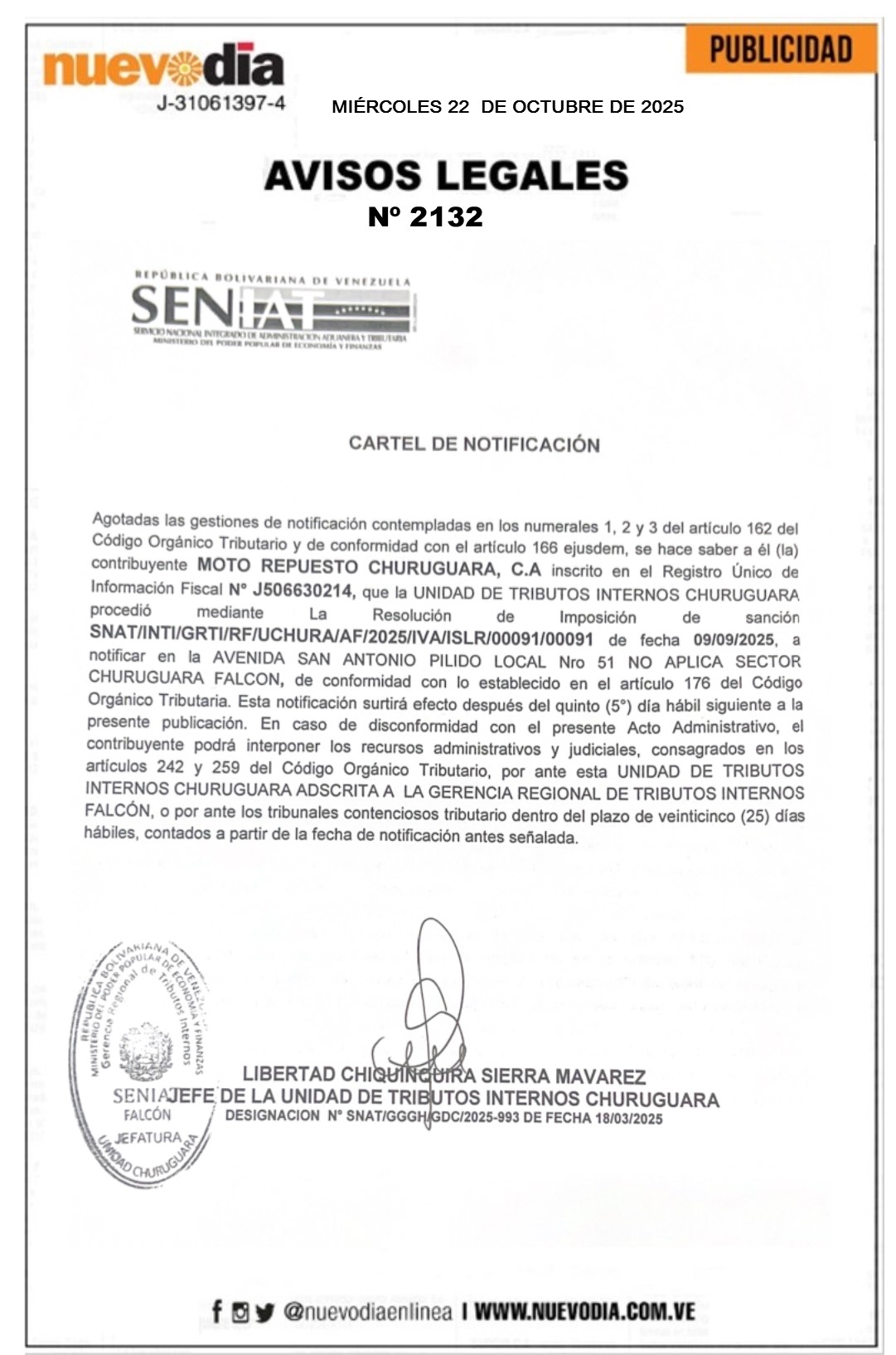 InicioPublicidadLegales PublicidadLegales Cartel de Notificación.Moto Repuesto Churuguara,C.A. 22/10/2025 FacebookTwitterPinterestWhatsApp 2132. 22-10-2025 Cuota FacebookTwitterPinterestWhatsApp Artículo anteriorCartel de Notificación.El Imperio de las Motos S.G, C.A.Artículo siguienteCartel de Notificación.Comercial El Centro 2011, C.A. Mercadeo NuevoDia Noticias Relacionadas Legales Cartel de Notificación.Automercado Virgen del Carmen, C.A. Legales Cartel de Notificación.Samor,C.A. Legales Cartel de Notificación.Agrototal 2019,C.A. Redes Sociales20,299FansMe gusta112,425SeguidoresSeguir4,600SuscriptoresSuscribirte Últimas noticias Destacadas PDVSA factura $ 11.700 millones en nueve meses por exportaciones petroleras Destacadas Trasladan fiesta de los santos a parroquias por gran cantidad de fieles (COMUNICADO) Cargar más