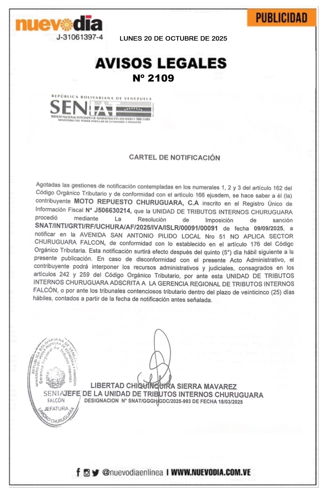 InicioPublicidadLegales PublicidadLegales Cartel de Notificación.Moto Repuestos Churuguara, C.A. 20/10/2025 FacebookTwitterPinterestWhatsApp 2109. 20-10-2025 Cuota FacebookTwitterPinterestWhatsApp Artículo anteriorCartel de Notificación.El Imperio de las Motos S.G,C.A.Artículo siguienteCartel de Notificación.Multiservicios Caribe 67, C.A. Mercadeo NuevoDia Noticias Relacionadas Legales Cartel de Notificación.Panadería, Pastelería y Charcutería La Reina 2020,C.A. Legales Cartel de Notificación.Repuestos, Autoperiqutos y Lubricantes Don Nicanor, C.A. Legales Cartel de Notificación.Multiservicios Santa Ines, C.A. Redes Sociales20,299FansMe gusta112,425SeguidoresSeguir4,600SuscriptoresSuscribirte Últimas noticias Destacadas Venezuela asume vicepresidencia de la Organización Internacional de Mediación Destacadas Mural de la Virgen de Coromoto es develado en los jardines del Vaticano Cargar más