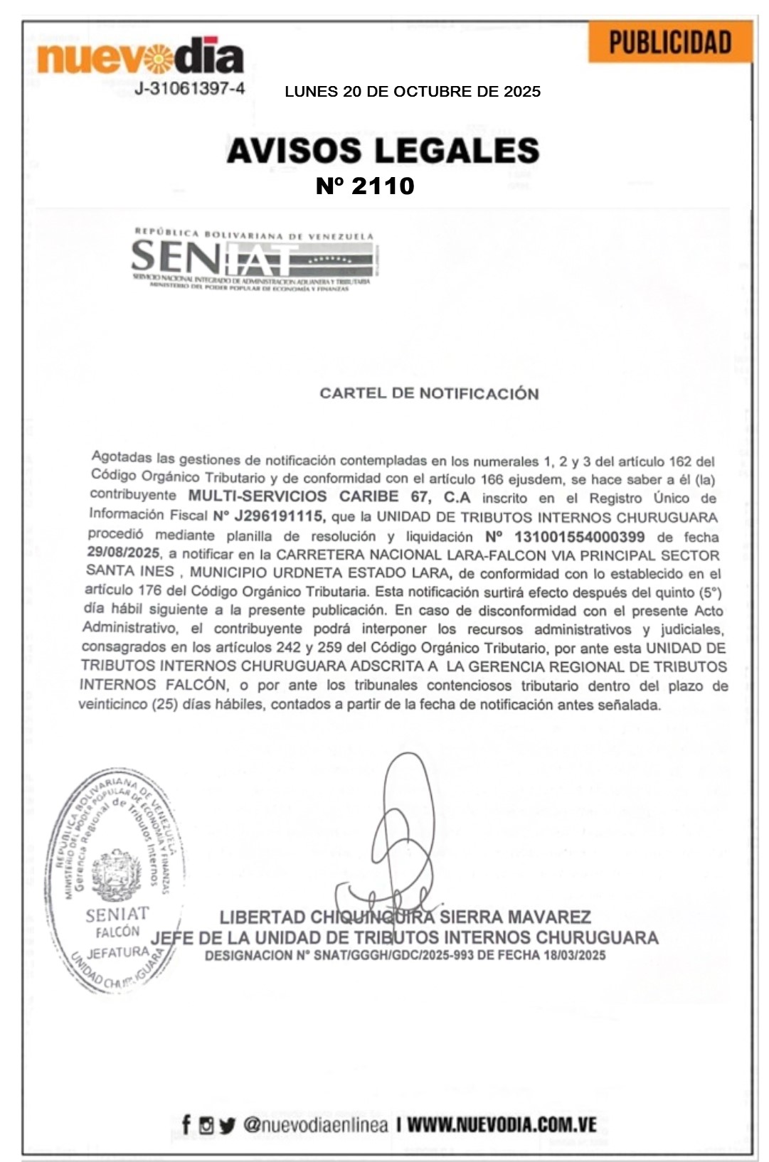 InicioPublicidadLegales PublicidadLegales Cartel de Notificación.Multiservicios Caribe 67, C.A. 20/10/2025 FacebookTwitterPinterestWhatsApp 2110. 20-10-2025 Cuota FacebookTwitterPinterestWhatsApp Artículo anteriorCartel de Notificación.Moto Repuestos Churuguara, C.A.Artículo siguienteCartel de Notificación.A.C. Iglesia Organización Cristiana y Misionera Juan 3:16 Mercadeo NuevoDia Noticias Relacionadas Legales Cartel de Notificación.Panadería, Pastelería y Charcutería La Reina 2020,C.A. Legales Cartel de Notificación.Repuestos, Autoperiqutos y Lubricantes Don Nicanor, C.A. Legales Cartel de Notificación.Multiservicios Santa Ines, C.A. Redes Sociales20,299FansMe gusta112,425SeguidoresSeguir4,600SuscriptoresSuscribirte Últimas noticias Destacadas Venezuela asume vicepresidencia de la Organización Internacional de Mediación Destacadas Mural de la Virgen de Coromoto es develado en los jardines del Vaticano Cargar más