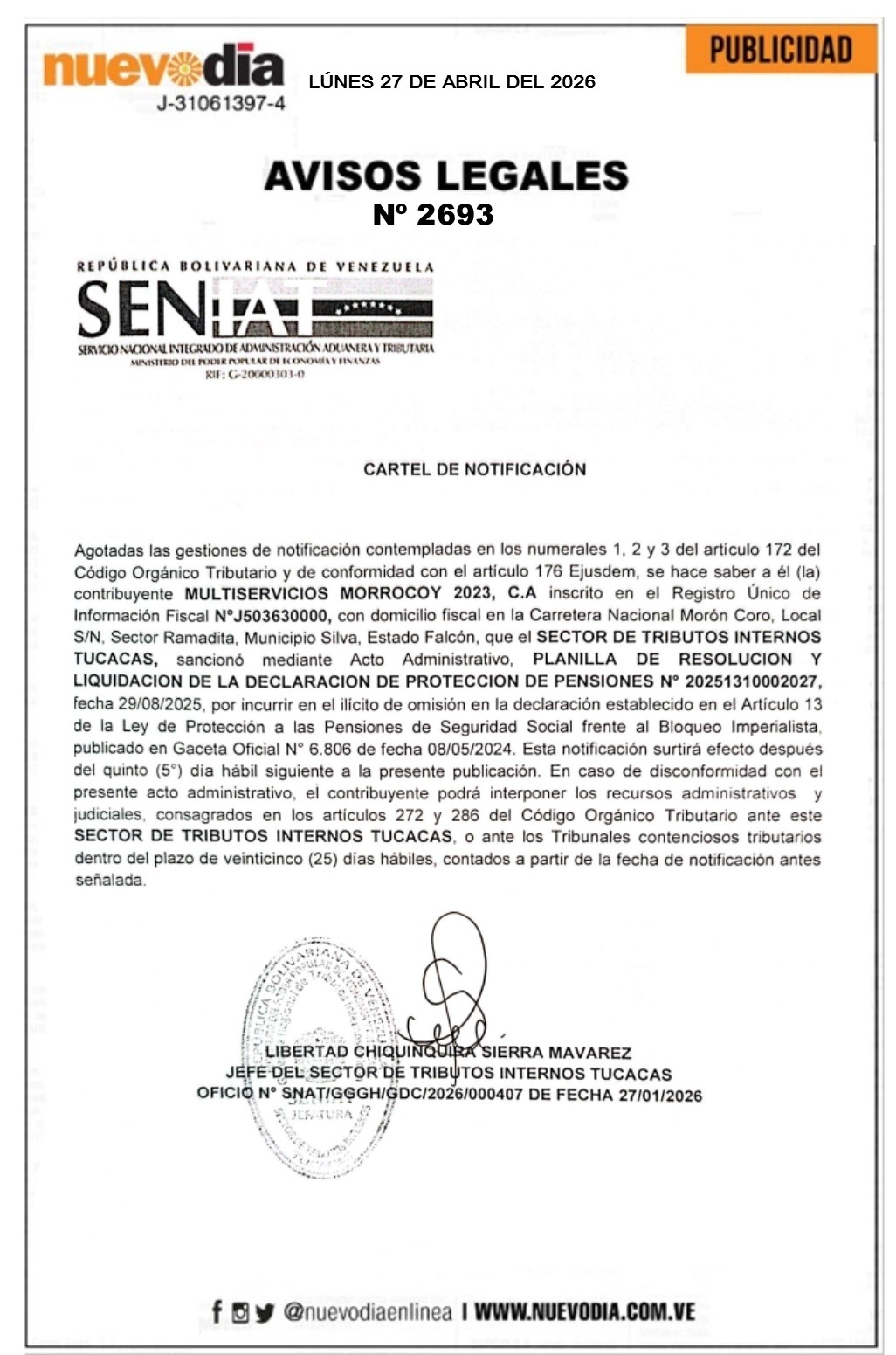 InicioPublicidadLegales PublicidadLegales Cartel de Notificación.Multiservicios Morrocoy 2023.C.A. 27/04/2026 FacebookTwitterPinterestWhatsApp 2693. 27-04-2026 Cuota FacebookTwitterPinterestWhatsApp Artículo anteriorCartel de Notificación.Todo Limpio Tucacas.C.A.Artículo siguienteCartel de Notificación.Piscinas Hidrotécnicas Tucacas.C.A. Mercadeo NuevoDia Noticias Relacionadas Legales Cartel de Notificación.Agroganadera Cerro El León.C.A. Legales Cartel de Notificación.Distribuidora El Gran Pollo 2017.C.A. Legales Cartel de Notificación.Corporación Turística Aguasanta.C.A. Redes Sociales20,299FansMe gusta112,425SeguidoresSeguir4,600SuscriptoresSuscribirte Últimas noticias Destacadas Rechazan fin de la Ley de Amnistía anunciado por Rodríguez Destacadas Así transcurrió la reunión entre Delcy Rodríguez y Petro (FOTOS) Cargar más