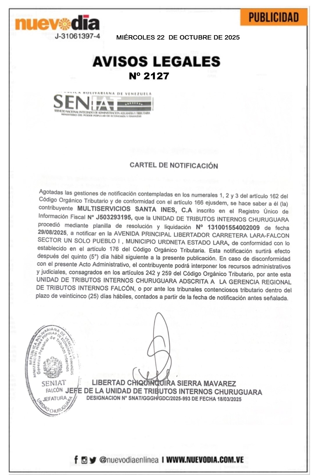 Cartel de Notificación.Multiservicios Santa Ines, C.A.