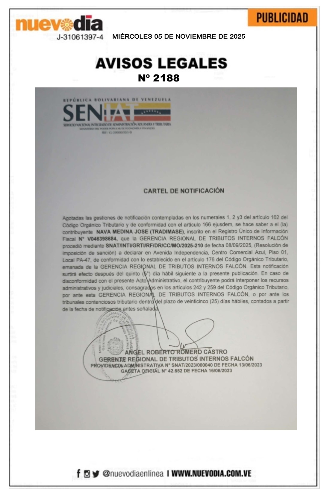 InicioPublicidadLegales PublicidadLegales Cartel de Notificación.Nava Medina José (Tradimase). 05/11/2025 FacebookTwitterPinterestWhatsApp 2188. 05-11-2025 Cuota FacebookTwitterPinterestWhatsApp Artículo anteriorCartel de Notificación.OII, C.A.Artículo siguienteCartel de Notificación.Droguería Drofal 2021, C.A. Mercadeo NuevoDia Noticias Relacionadas Legales Cartel de Notificación.Comercializadora Damasco,C.A. Legales Convocatoria Asamblea General.Instituto Universitario de Tecnología José Leonardo Chirino(IUTJLCH). Legales Cartel de Notificación.Comercializadora Damasco,C.A. Redes Sociales20,299FansMe gusta112,425SeguidoresSeguir4,600SuscriptoresSuscribirte Últimas noticias Destacadas Conoce el precio del dólar en Venezuela hoy 5-Nov Destacadas Cuarta Consulta Popular del 23-Nov tendrá 33.091 proyectos elegibles Cargar más