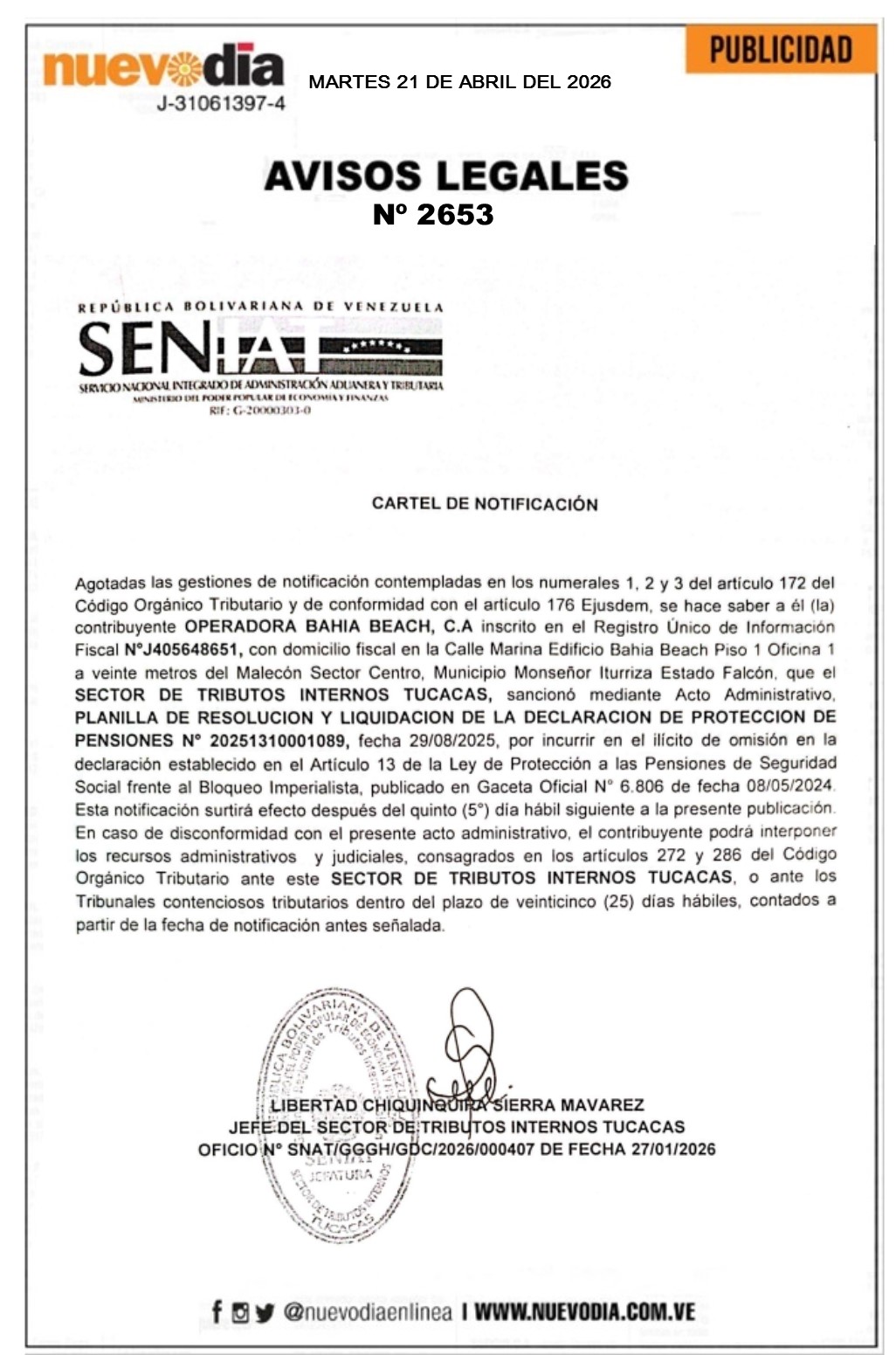 InicioPublicidadLegales PublicidadLegales Cartel de Notificación.Operadora Bahía Beach.C.A. 21/04/2026 FacebookTwitterPinterestWhatsApp 2653. 21-04-2026 Cuota FacebookTwitterPinterestWhatsApp Artículo anteriorFalcón dice presente en los Juegos Nacionales Juveniles de billarArtículo siguienteJorge Arreaza: María Corina no aplica para ser beneficiada por la Ley de Amnistía Mercadeo NuevoDia Noticias Relacionadas Legales Cartel de Notificación.Inversiones Luismarys 207.C.A. Legales Cartel de Notificación.Inversiones Hosana en las Alturas.C.A. Legales Cartel de Notificación.Fumiclean Falcón.C.A. Redes Sociales20,299FansMe gusta112,425SeguidoresSeguir4,600SuscriptoresSuscribirte Últimas noticias Destacadas AN prepara selección del comité encargado de evaluar aspirantes a magistrados del TSJ Destacadas Jorge Arreaza: María Corina no aplica para ser beneficiada por la Ley de Amnistía Cargar más