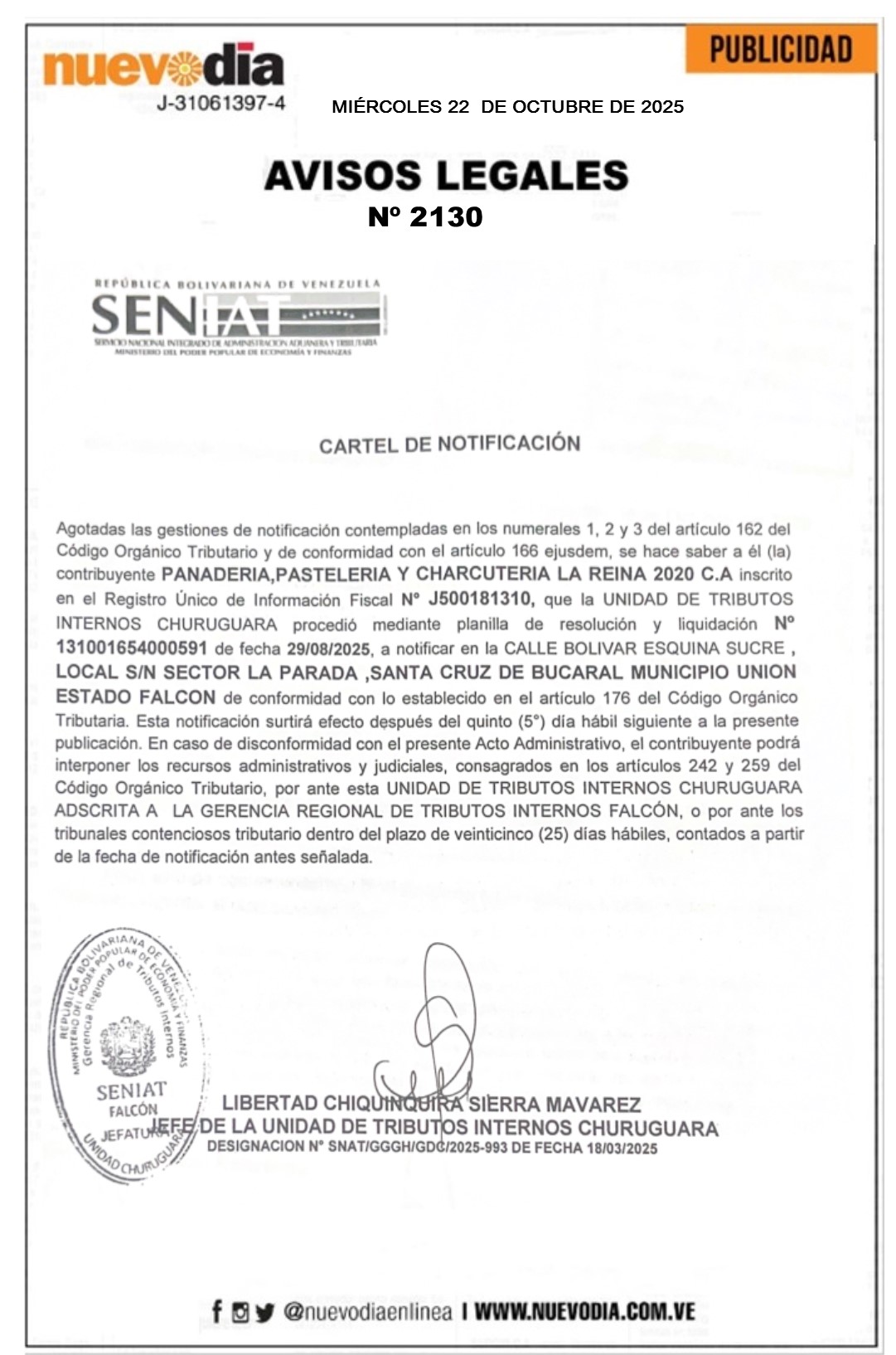 InicioPublicidadLegales PublicidadLegales Cartel de Notificación.Panadería, Pastelería y Charcutería La Reina 2020,C.A. 22/10/2025 FacebookTwitterPinterestWhatsApp 2130. 22-10-2025 Cuota FacebookTwitterPinterestWhatsApp Artículo anteriorCartel de Notificación.Repuestos, Autoperiquitos y Lubricantes Don Nicanor, C.A.Artículo siguienteCartel de Notificación.El Imperio de las Motos S.G, C.A. Mercadeo NuevoDia Noticias Relacionadas Legales Cartel de Notificación.Automercado Virgen del Carmen, C.A. Legales Cartel de Notificación.Samor,C.A. Legales Cartel de Notificación.Agrototal 2019,C.A. Redes Sociales20,299FansMe gusta112,425SeguidoresSeguir4,600SuscriptoresSuscribirte Últimas noticias Destacadas PDVSA factura $ 11.700 millones en nueve meses por exportaciones petroleras Destacadas Trasladan fiesta de los santos a parroquias por gran cantidad de fieles (COMUNICADO) Cargar más