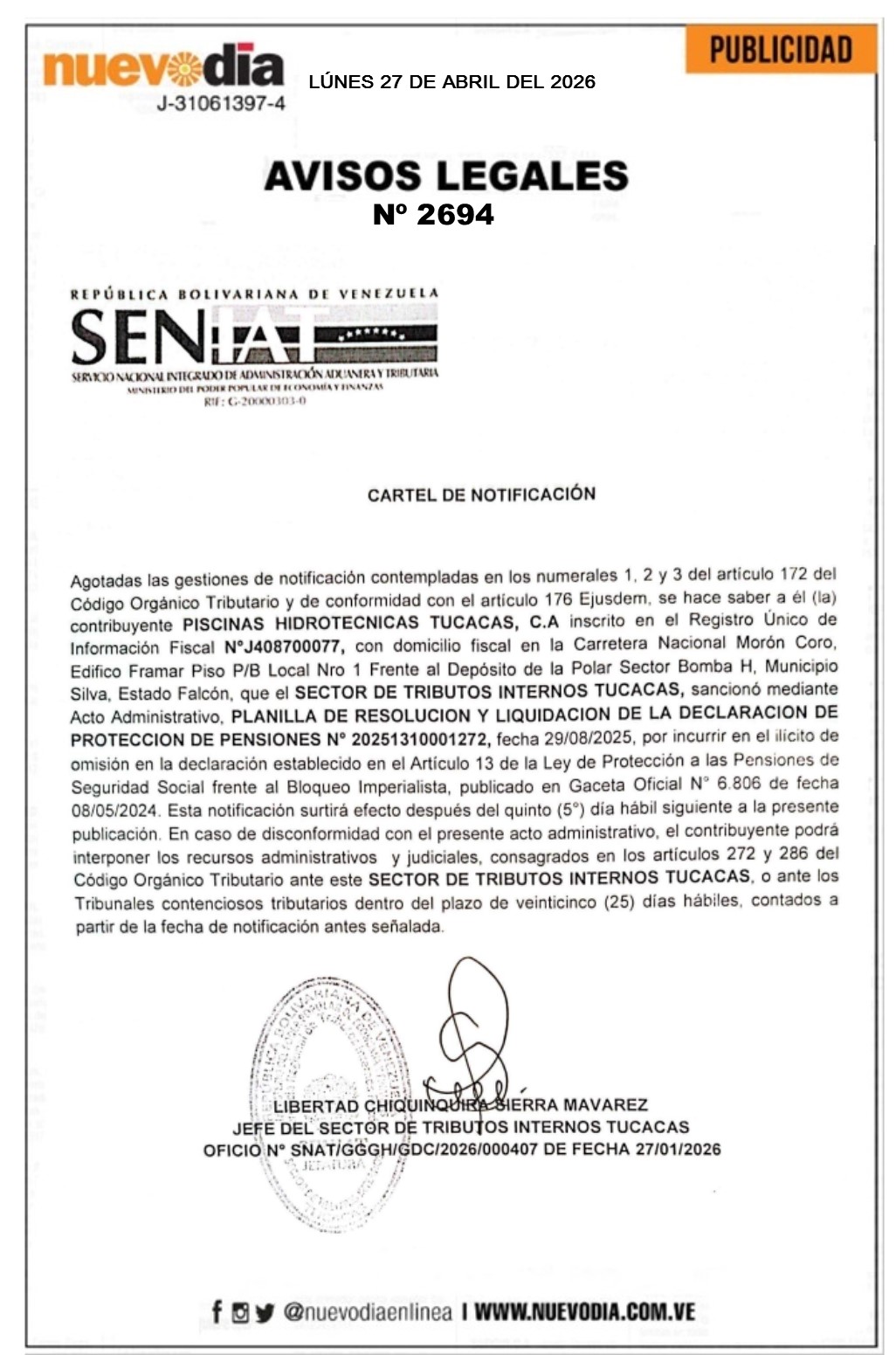 InicioPublicidadLegales PublicidadLegales Cartel de Notificación.Piscinas Hidrotécnicas Tucacas.C.A. 27/04/2026 FacebookTwitterPinterestWhatsApp 2694. 27-04-206 Cuota FacebookTwitterPinterestWhatsApp Artículo anteriorCartel de Notificación.Multiservicios Morrocoy 2023.C.A.Artículo siguienteCartel de Notificación.Inversiones Marina Varadero.C.A. Mercadeo NuevoDia Noticias Relacionadas Legales Cartel de Notificación.Agroganadera Cerro El León.C.A. Legales Cartel de Notificación.Distribuidora El Gran Pollo 2017.C.A. Legales Cartel de Notificación.Corporación Turística Aguasanta.C.A. Redes Sociales20,299FansMe gusta112,425SeguidoresSeguir4,600SuscriptoresSuscribirte Últimas noticias Destacadas Rechazan fin de la Ley de Amnistía anunciado por Rodríguez Destacadas Así transcurrió la reunión entre Delcy Rodríguez y Petro (FOTOS) Cargar más