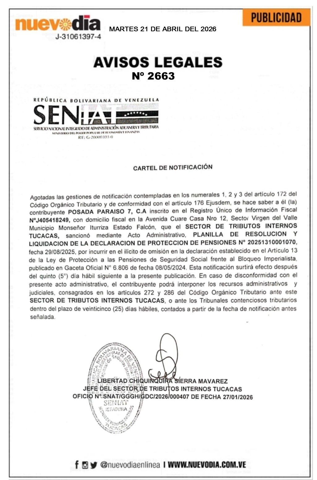 InicioPublicidadLegales PublicidadLegales Cartel de Notificación.Posada Paraiso 7.C.A. 21/04/2026 FacebookTwitterPinterestWhatsApp 2663. 21-04-2026 Cuota FacebookTwitterPinterestWhatsApp Artículo anteriorCartel de Notificación.Distribuidora El Novillo.C.A.Artículo siguienteCarlos III le dedica emotivo mensaje a su madre Isabel II por su cumpleaños 100 Mercadeo NuevoDia Noticias Relacionadas Legales Cartel de Notificación.Inversiones Luismarys 207.C.A. Legales Cartel de Notificación.Inversiones Hosana en las Alturas.C.A. Legales Cartel de Notificación.Fumiclean Falcón.C.A. Redes Sociales20,299FansMe gusta112,425SeguidoresSeguir4,600SuscriptoresSuscribirte Últimas noticias Destacadas AN prepara selección del comité encargado de evaluar aspirantes a magistrados del TSJ Destacadas Jorge Arreaza: María Corina no aplica para ser beneficiada por la Ley de Amnistía Cargar más